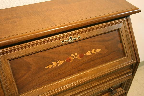書面正面側と引き出しにはイタリア伝統の象嵌(木の薄皮を貼り合わせて模様を作る伝統的な装飾技法)が入っていて、とてもエレガントです。