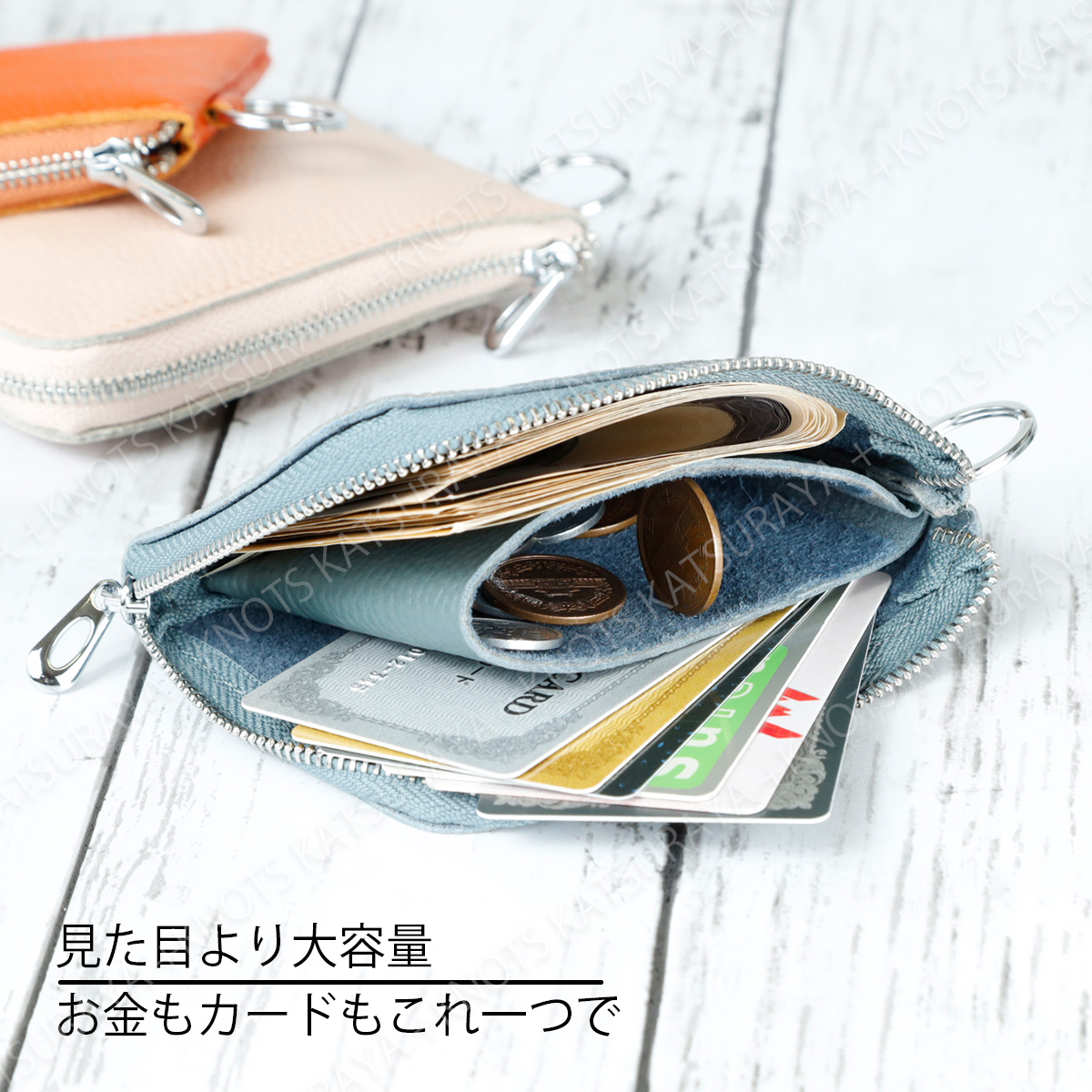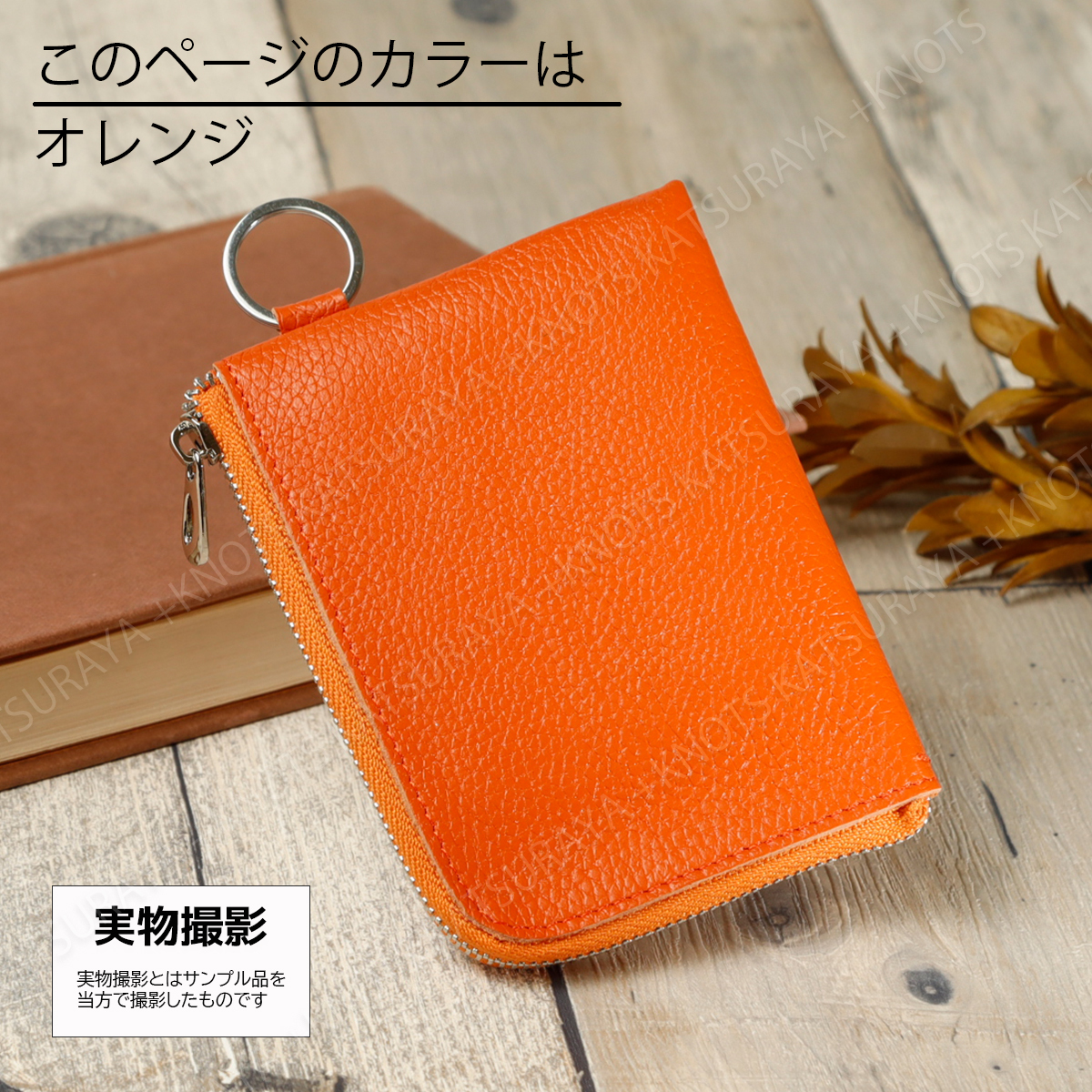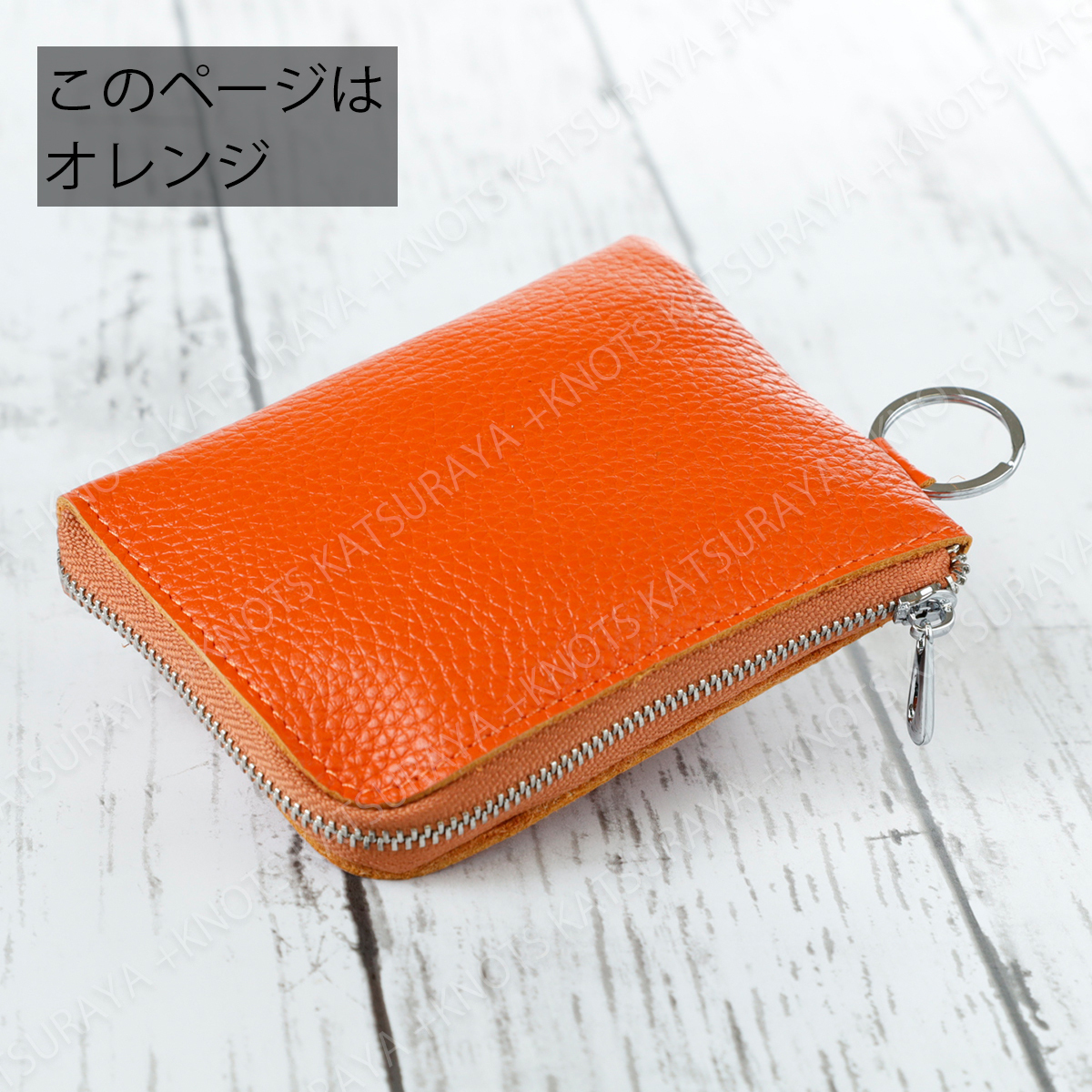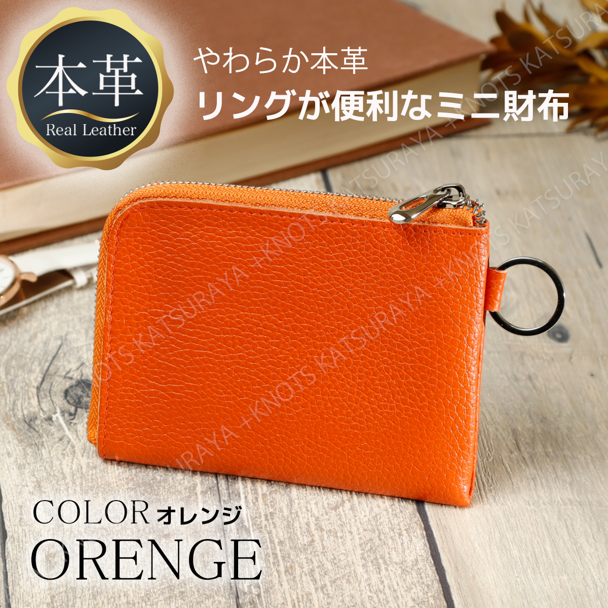 本革 リング付き L字ファスナー ミニ財布★オレンジ★レディース メンズ 柔らかい 小さい コンパクト スリム 薄い 軽い レザー 牛革a274