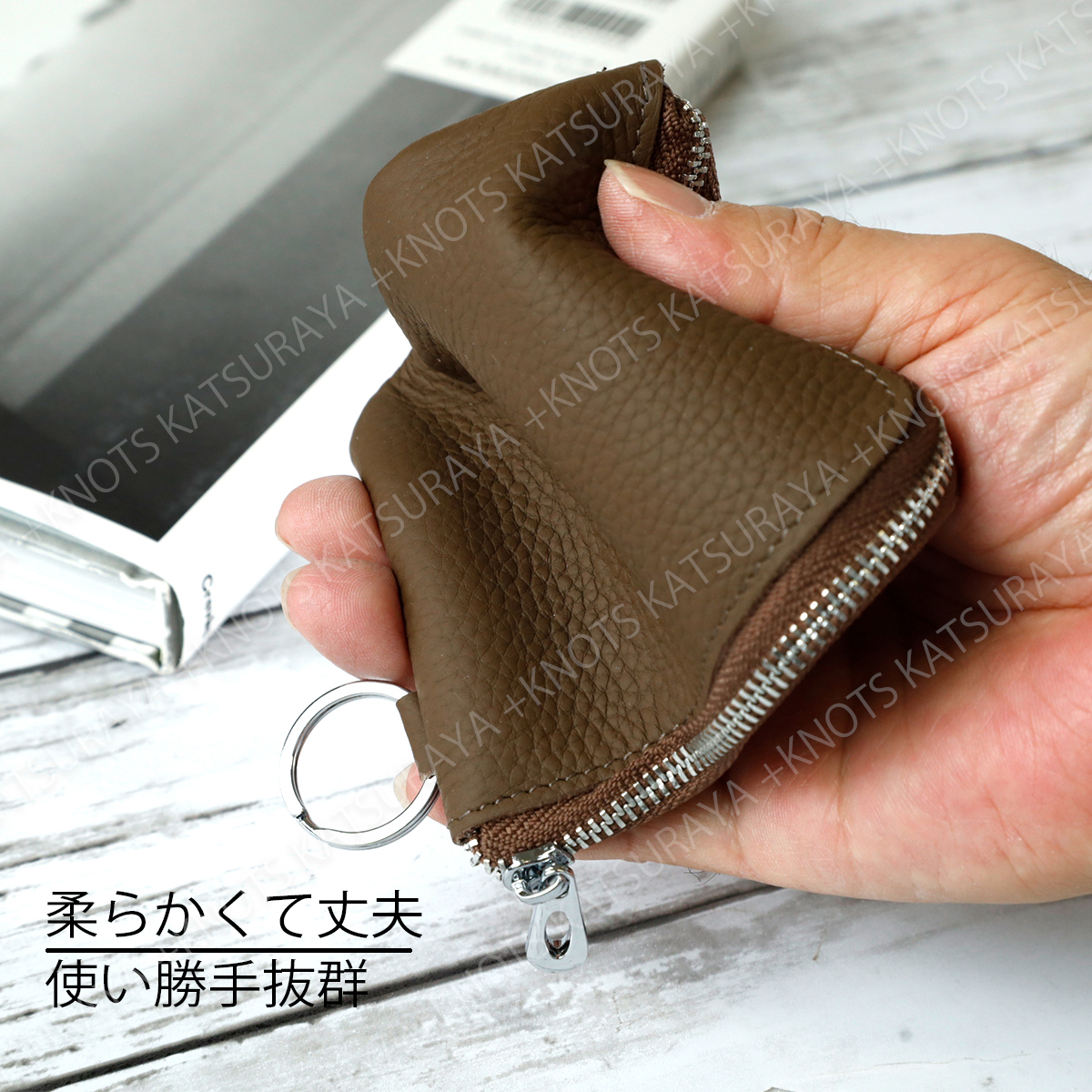 柔らかく手触りのいい小さめL字ファスナー財布です。シボがあり内張りが無いので皮が本来持つ味や高級感を楽しむことができます。大きなメインポケットが2つ有るのでお札やカードをたくさん入れてもスッキリ収まります。内部のサブポケットには小銭や小物などを入れることができ使い勝手抜群。外側に付いたリングには鍵などを通すことができ、この財布一つで身軽に外出が可能です。