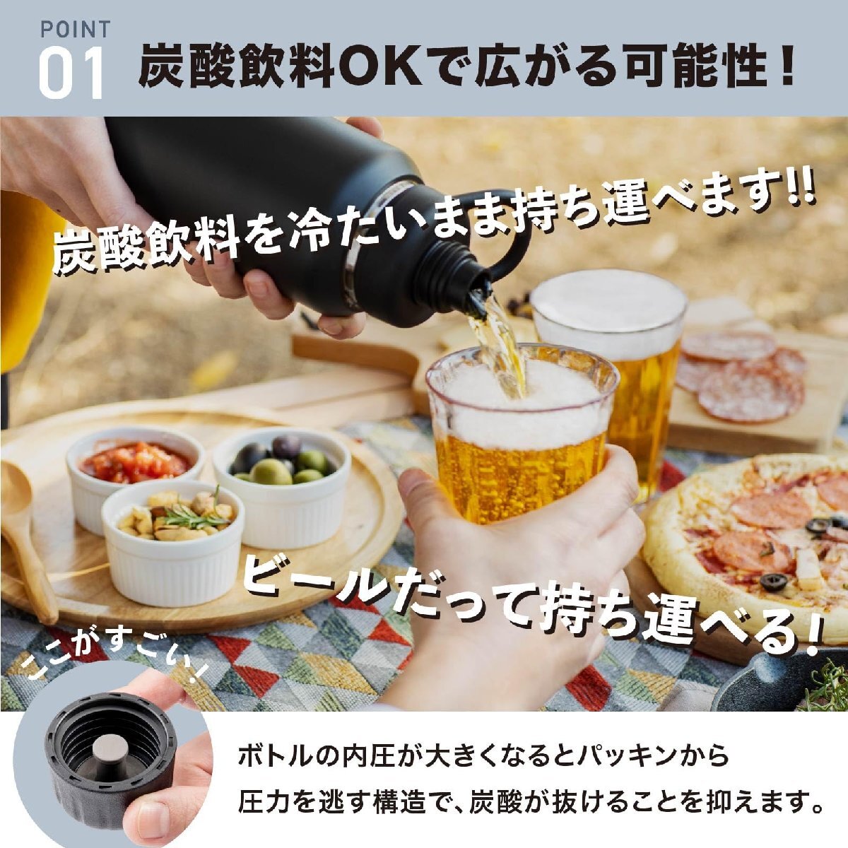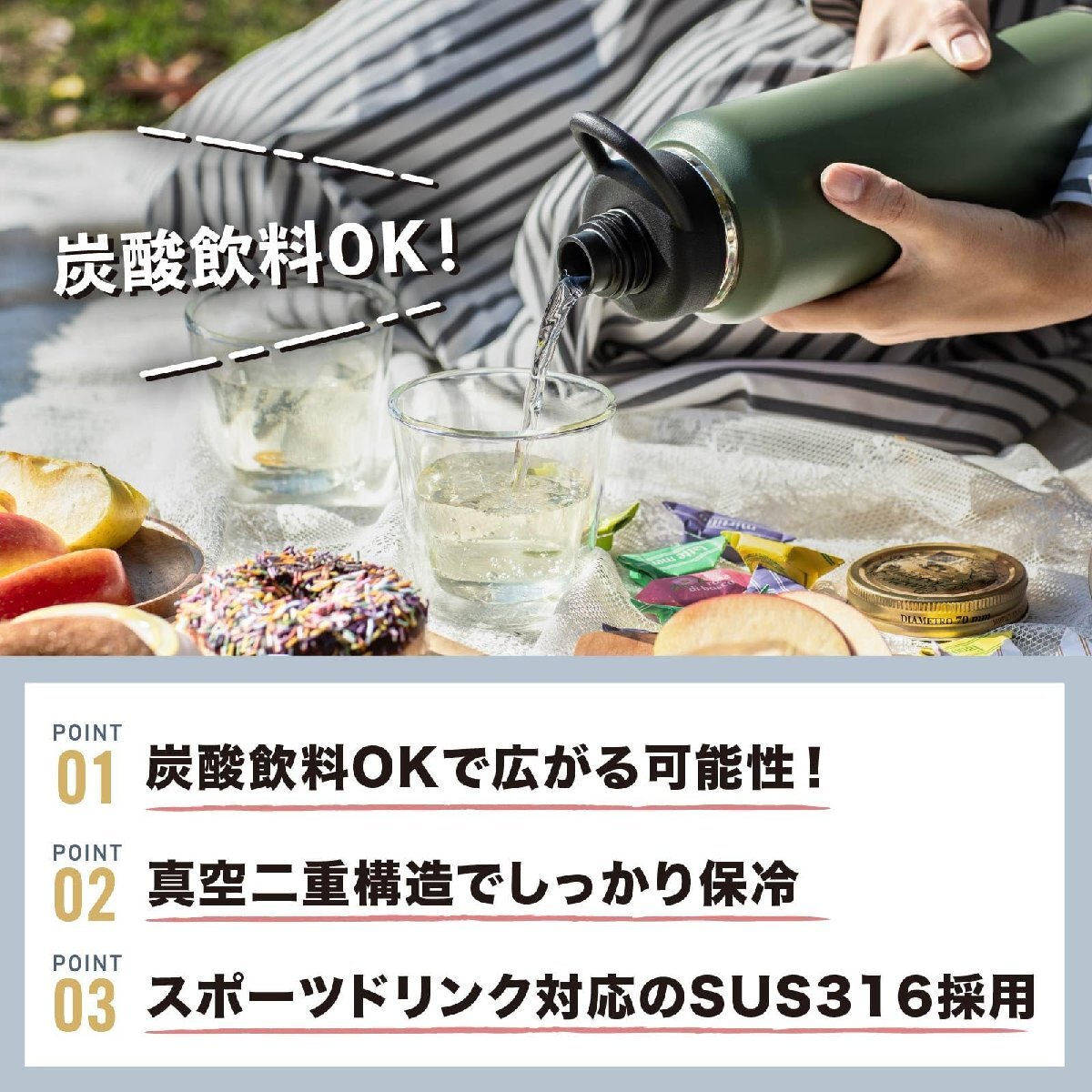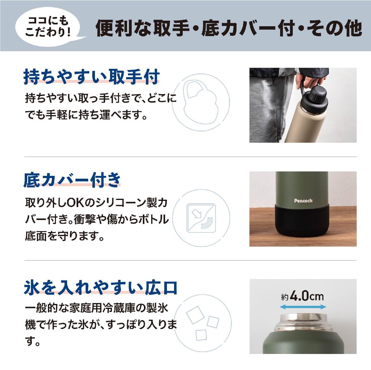 ブランド:ピーコック魔法瓶工業(The-peacock)カラー:カーキサイズ:1000mlスポーツドリンク、炭酸飲料対応ボトル。●衝撃や傷から水筒を守るシリコーン製の底カバー付き。●真空二重構造でしっかり保冷できます。【炭酸を持ち運べるボトル】ボトルの内圧が大きくなるとパッキンから圧力を逃がす構造で、炭酸が抜けにくい水筒です。