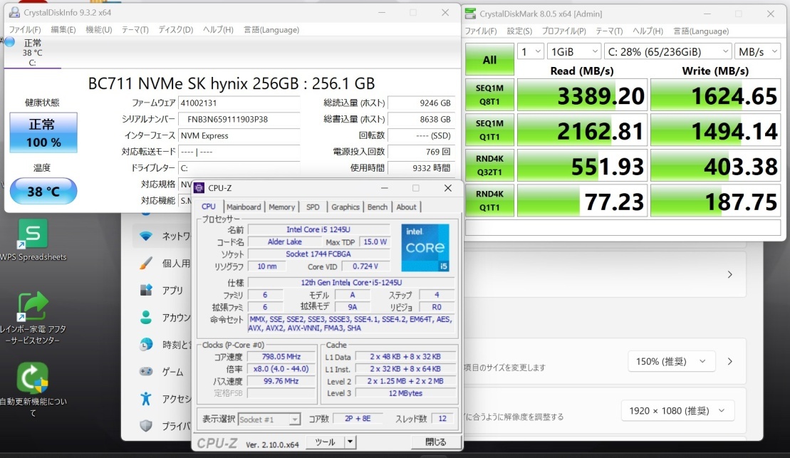 | CPU: 超高速 Intel 卓越性能 第12世代Core i5-1245u 3.3Ghz、 (ターボ・ブースト利用時の最大周波数 3.7GHz) |