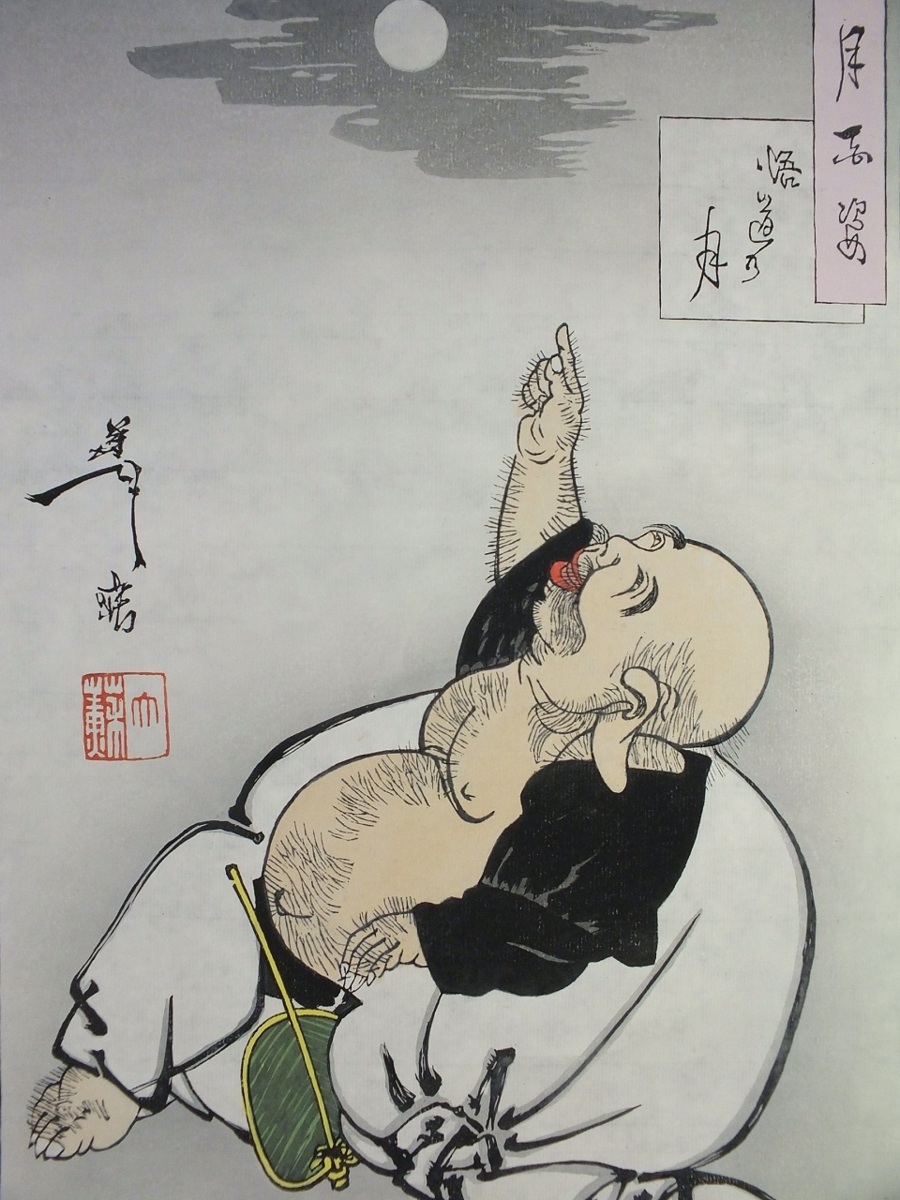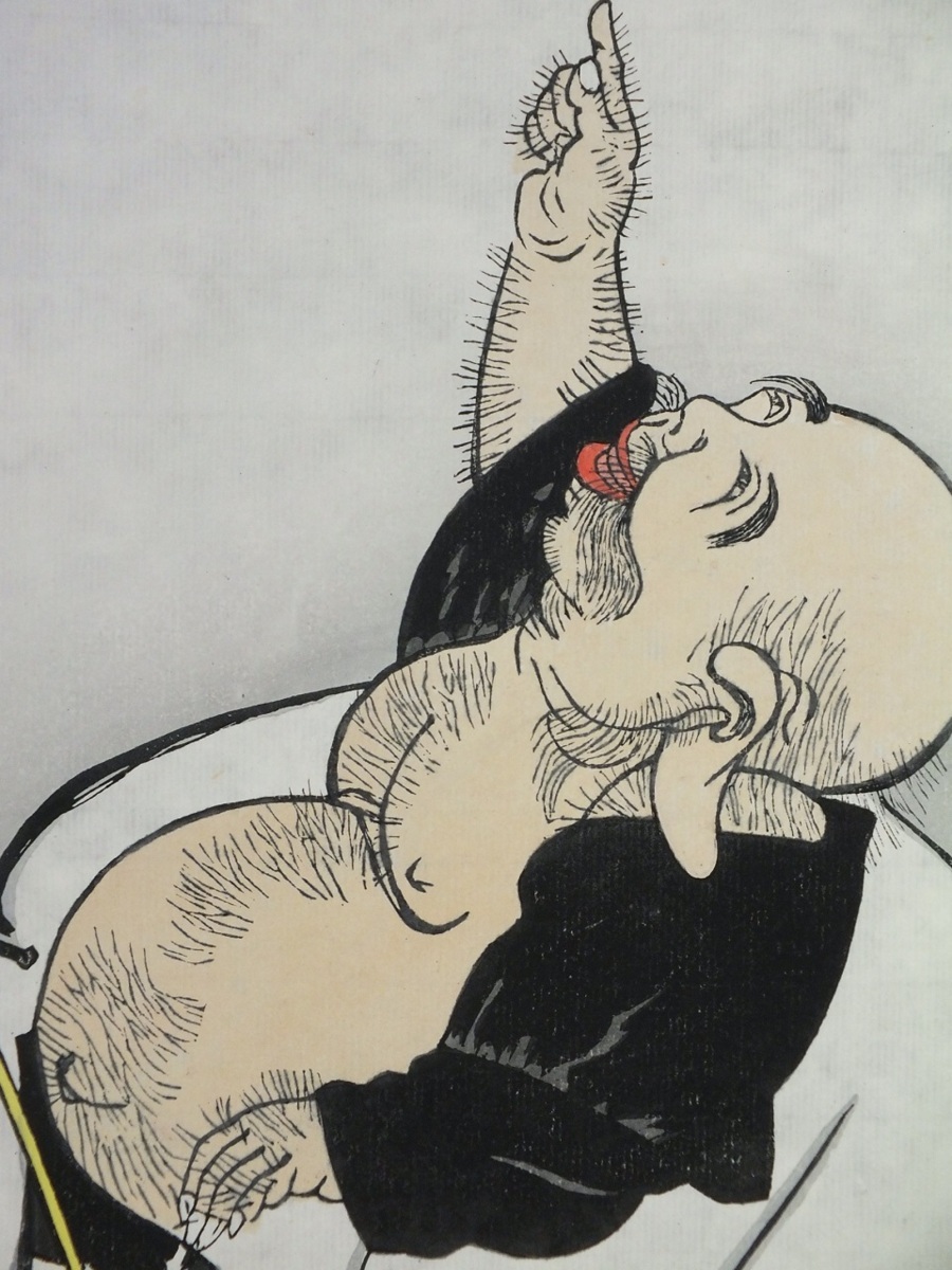 | ▲商品説明▲ | 外寸(約):320×430mm 絵サイズ:250×370mm 技法(種別):木版画 紙質:和紙 独特の画風が人気の浮世絵師、月岡芳年。その連作「月百姿」の『悟道の月』です。龍香堂と親交の有る版画研究室から買い取りました。芳年の得意とする構図の妙を手摺木版で忠実に復刻した作品です。 ◎当品は和紙1枚の状態です。額飾しておりません。 ※画像4は、作品の裏面と使用した版木です。版画用染料が裏写りしているのは、印刷ではないことの証しです。 ●月岡 芳年(つきおか よしとし):幕末から明治前期にかけての浮世絵師。12歳で歌川国芳に入門。その画業は幅広く、歴史絵・美人画・風俗画・古典画・合戦絵など多種多様な浮世絵を手がけ、各分野で独特の画風がある。構図や技法の点で工夫が見られ、動きの瞬間をストップモーションのように止めて見せる技法は現代のマンガや劇画に通じるものがあり、劇画の先駆者との評もある。 【作品解説】 『月百姿(つきひゃくし)』:1885~1892年の7年間の歳月をかけて発表した大判錦絵。月岡芳年は自分の名から月に対する思い入れが深く、晩年の傑作として『月百姿』という月にちなんだ説話、能、歌舞伎を題材にした百枚に及ぶ連作を描いている。 『悟道の月』:「悟道」とは、悟りを開き道理を会得するという意味の仏語で、その蟠りのない心の象徴は円形であると言われている。七福神の一人、かなり恰幅の良い布袋和尚が大袋にもたれ満面の笑みで、悟りの象徴である満月を指差すこの姿は「細かな経典などに捕らわれず大局を見よ」つまり「細かなことは気にせず楽しく生きよ」と禅の教えを無垢に示している縁起の良い作品である。  |