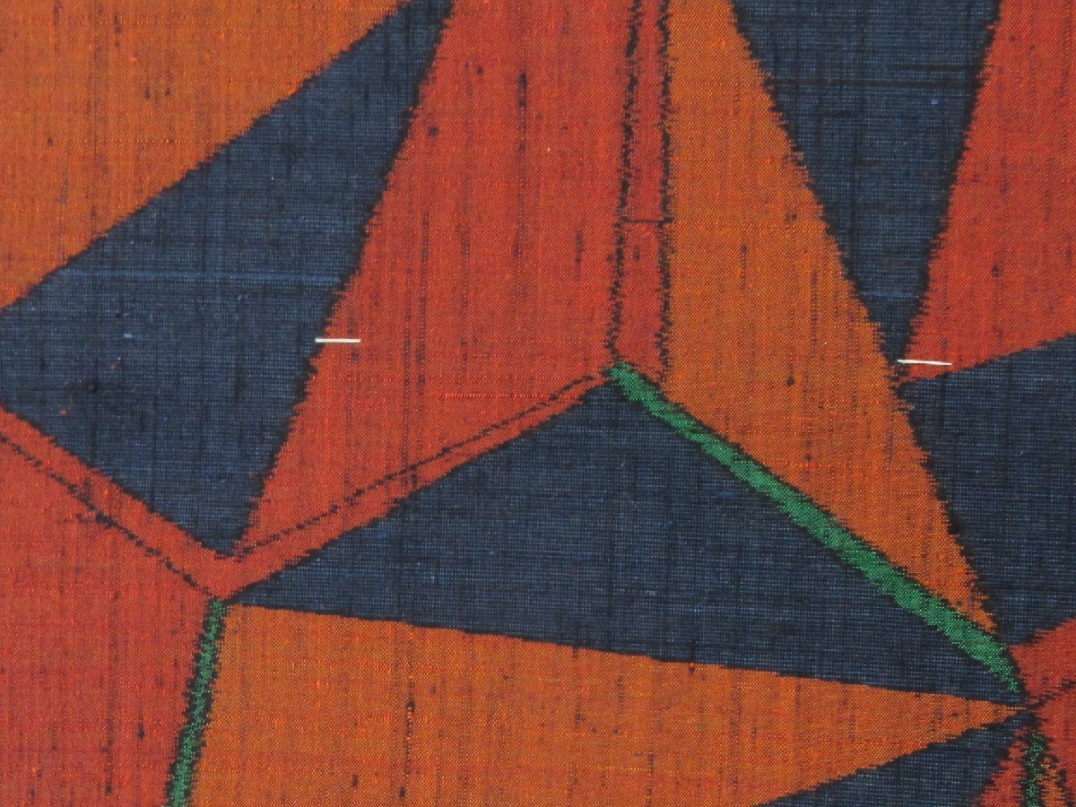赤色系の糸で織り込んだ、正絹 紬 反物 未使用品となります。