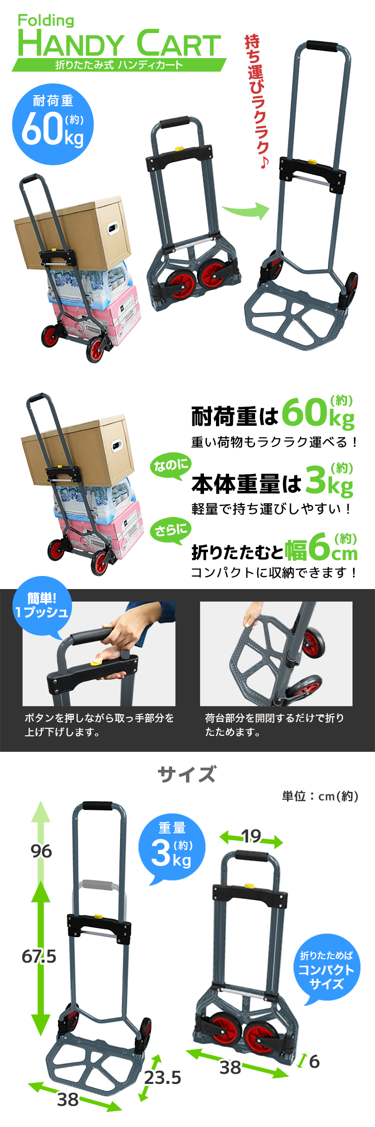 | ハンディーカート 折りたたみ 重たい荷物も平気な60kgタイプ! |