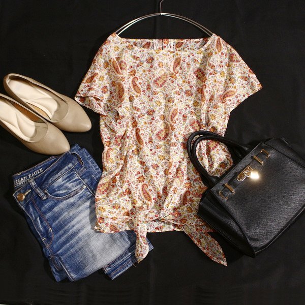 裾リボンのペイズリー柄、薄手カットソーです。