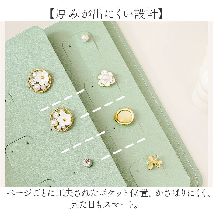 商品説明 | ・・【お気に入りをすっきり整理♪】 ・アクセサリーの整理がひと目で完結。気軽に持ち歩ける「ピアス アクセサリー収納ケース」 ・【ピアス42セット収納OK】 ・ピアスやイヤリングをすっきり収納。たっぷり入ってもかさばらないコンパクトサイズ。 ・【厚みが出にくい設計】 ・ページごとに工夫されたポケット位置。かさばりにくく、見た目もスマート。 ・【見開き仕様でひと目で把握】 ・本のように開ける構造で、アクセサリーが一目瞭然。探す手間がなくて便利♪ ・【柔らか生地で傷つけにくい】 ・前後のポケットに柔らかい内生地を採用。時計やブレスレットも安心して持ち運べる設計。 ・【ベルト付きで調節も簡単】 ・スナップボタン付きのベルトで、しっかりホールド。荷物の多い日も安心。 ・【少し濡れてもあわてない!】 ・表面は撥水加工の生地。汚れや水滴もサッと拭けて扱いやすさ◎ ・(※)完全防水ではありません。 ・【くすみカラーで大人可愛い】 ・旅行や出張の荷物にもなじむ落ち着いた色味。上品さと可愛さを両立したカラー展開。 |
