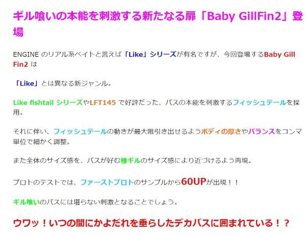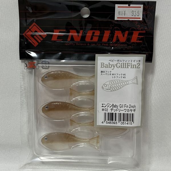 ギル喰いの本能を刺激する新たなる扉「Baby GillFin2」登場。ENGINE のリアル系ベイトと言えば「Like」シリーズが有名ですが、今回登場するBaby Gill Fin2 は「Like」とは異なる新ジャンル。Like fishtail シリーズやLFT145 で好評だった、バスの本能を刺激するフィッシュテールを採用。それに伴い、フィッシュテールの動きが最大限引き出せるようボディの厚さやバランスをコンマ単位で細かく調整。また全体のサイズ感を、バスが好む稚ギルのサイズ感により近づけるよう再現。■日本郵便クリックポスト:ポスト投函でのお届け(日時指定不可、未着・破損の保証無)