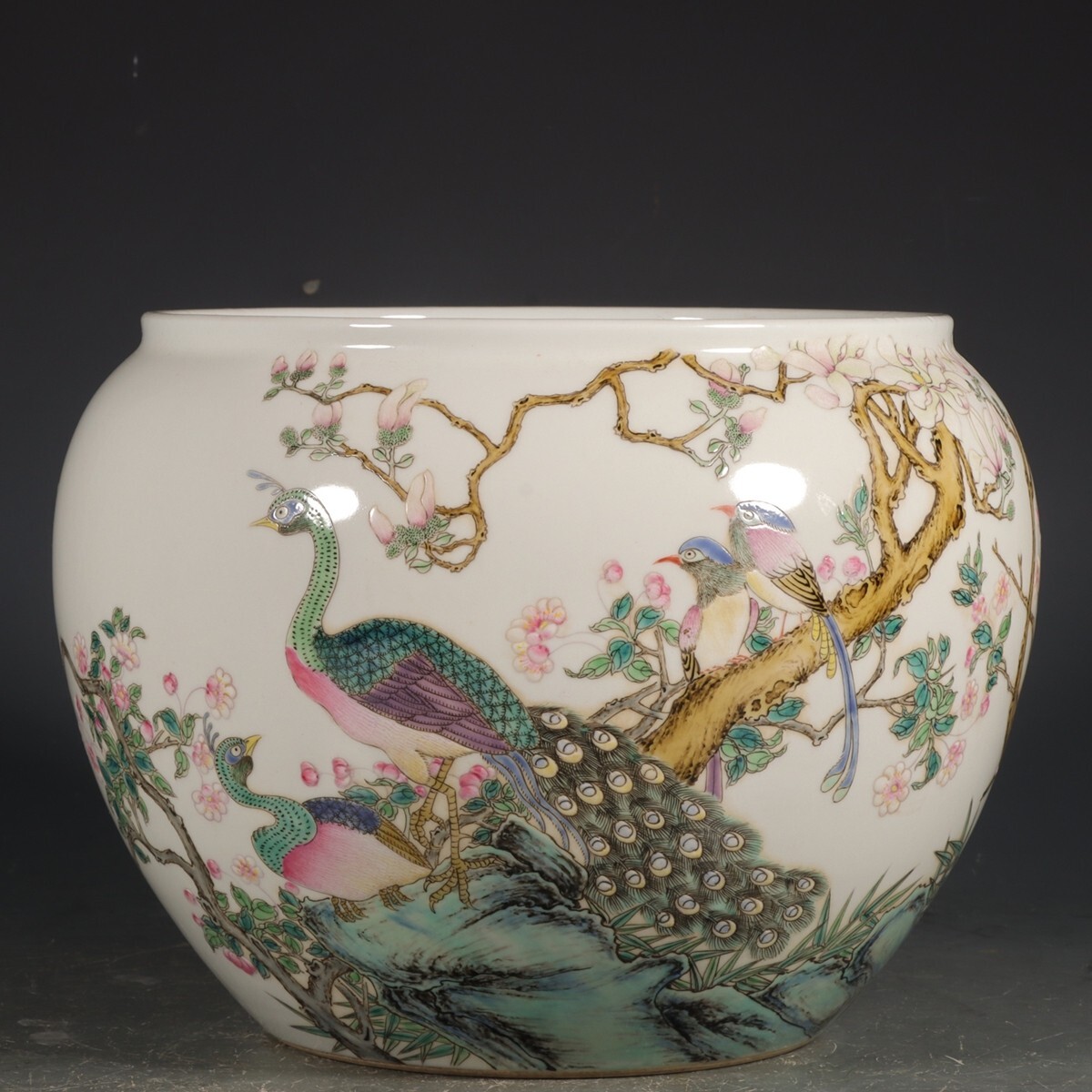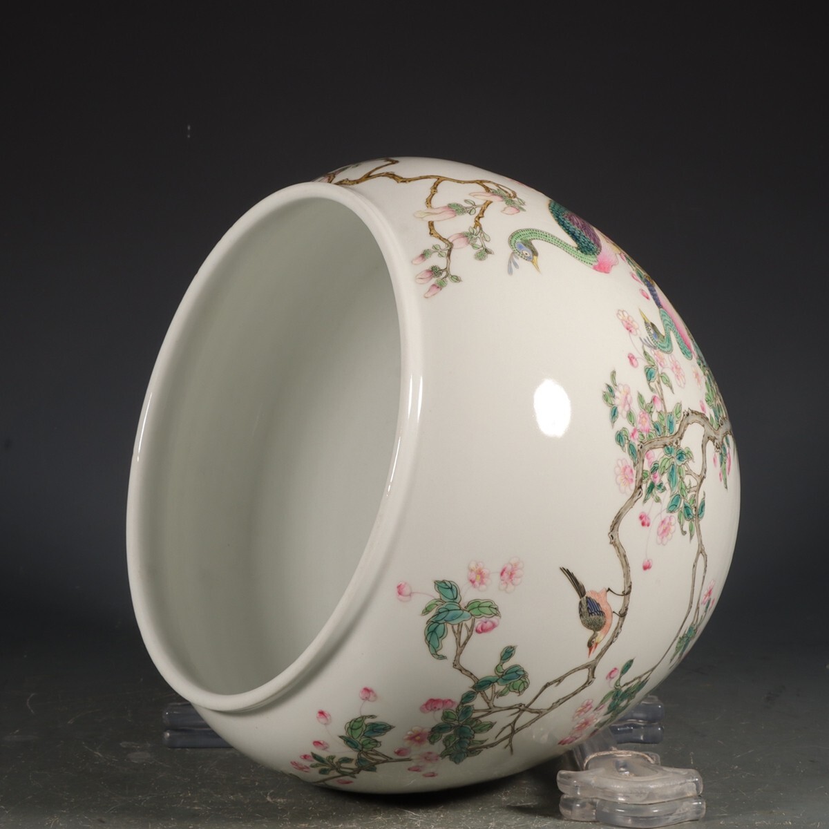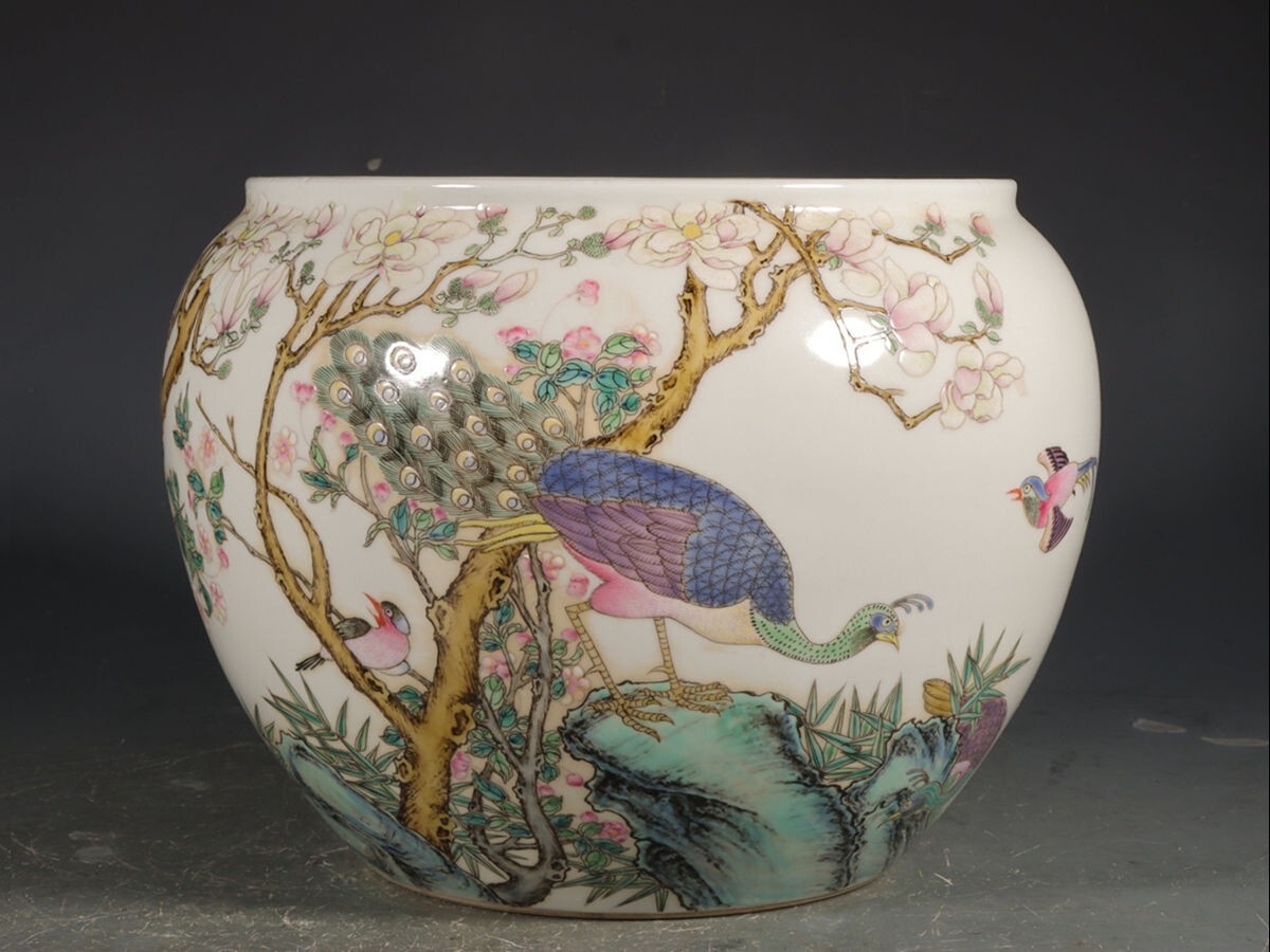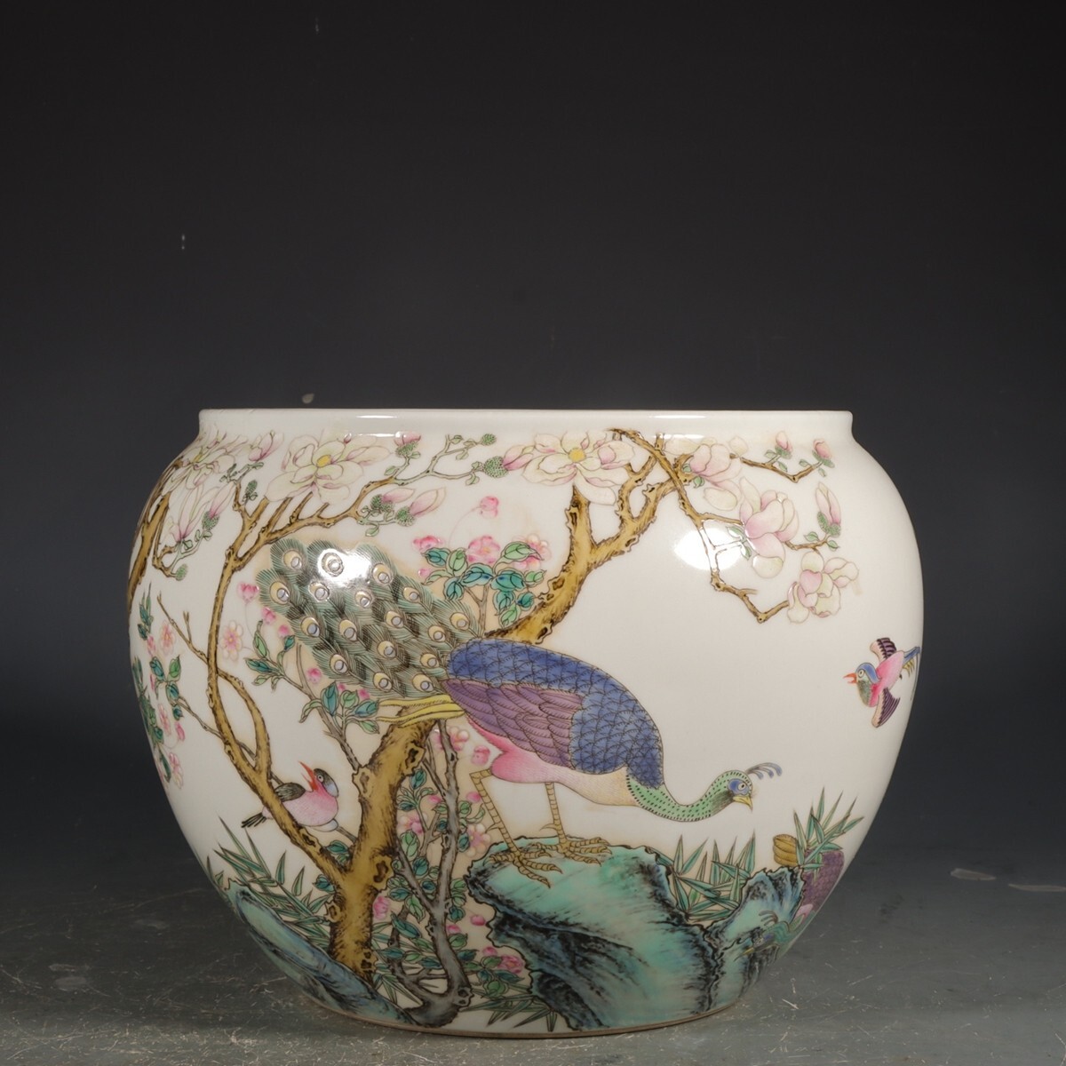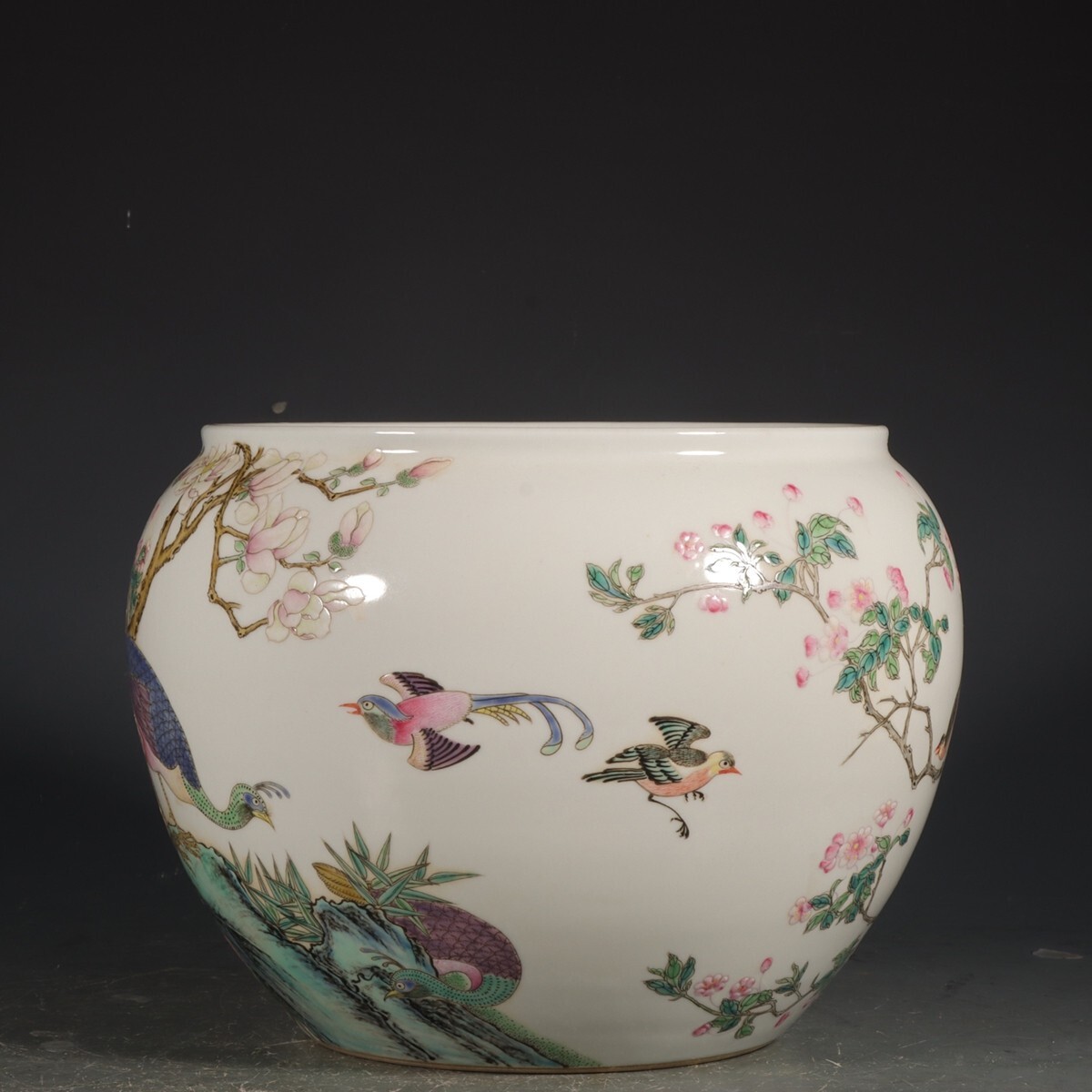 「清 乾隆年製 陶磁器 粉彩花鳥紋 缸」染付 置物 擺件 古賞物 中国古美術 旧蔵出