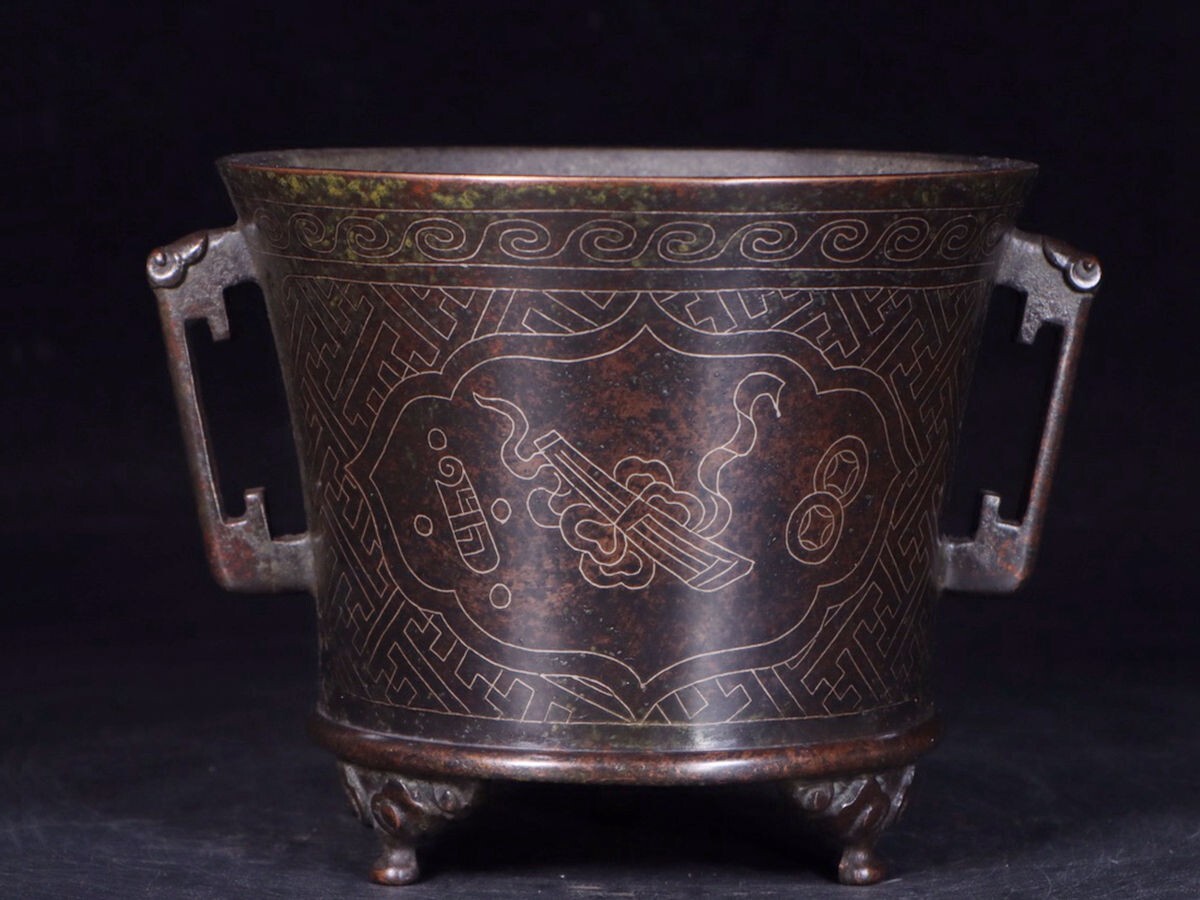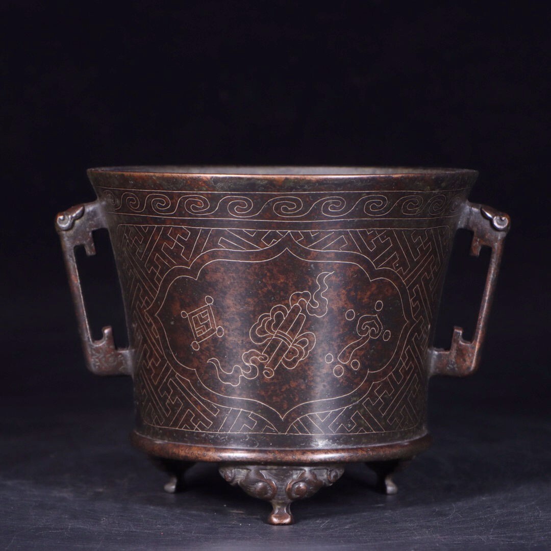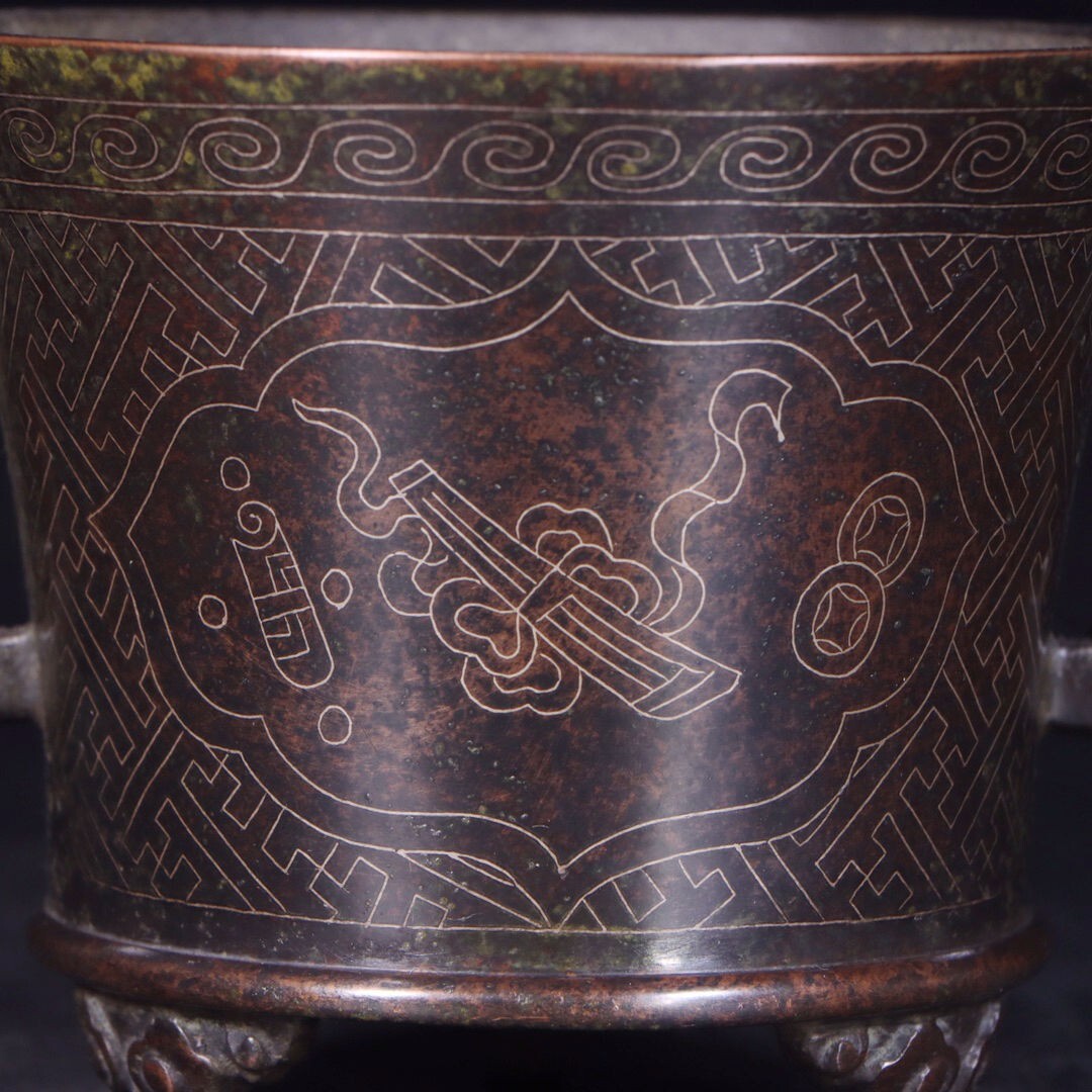 「明代 石叟 古銅彫 錯銀絲 龍耳老銅香炉」旧銅器 置物擺件 賞物 中国古美術 旧蔵出