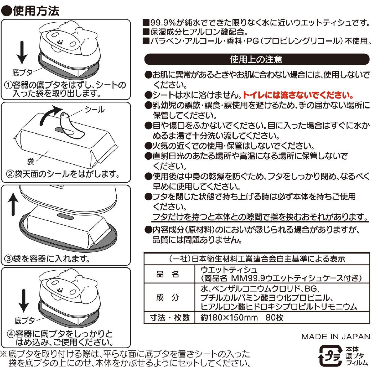 「マイメロディ 水99.9% ウェットティシュ ケース付き」▼4903320482319▼(商品説明)・ 1個 (x 1) SS-231・商品サイズ (幅×奥行×高さ) :210×135×70mm・原産国:日本・内容量:80枚入・材質:ポリプロピレン、ABS樹脂、ポリエチレン、ステンレス説明 商品紹介 ●かわいいマイメロディのウェットティッシュケース。 ●99.9%が純水でできた、限りなく水に近いウェットティッシュです。 ●パラベン・アルコール・香料・PG不使用でお子様やペットにも安心です。 ●保湿成分ヒアルロン酸配合。 ●詰め替え用「マイメロディ 水99.9% ウエットティシュ 80枚入×3個」がございます。・原材料・成分 水、ベンザルコニウムクロリド、BG、ブチルカルバミン酸ヨウ化プロピニル、ヒアルロン酸ヒドロキシプロピルトリモニウム