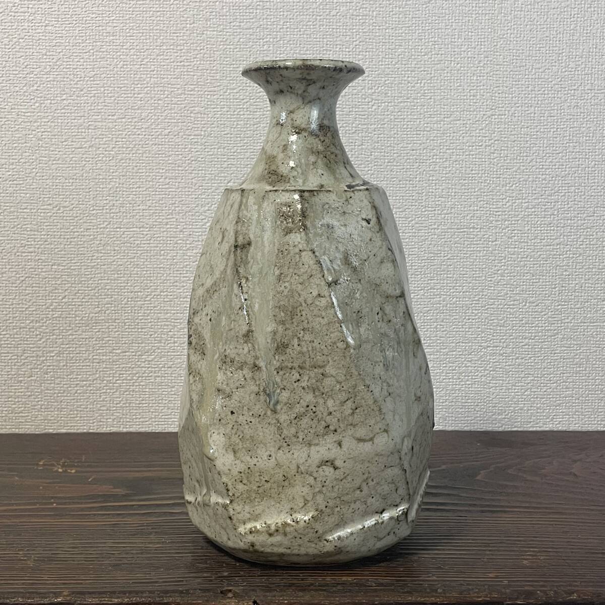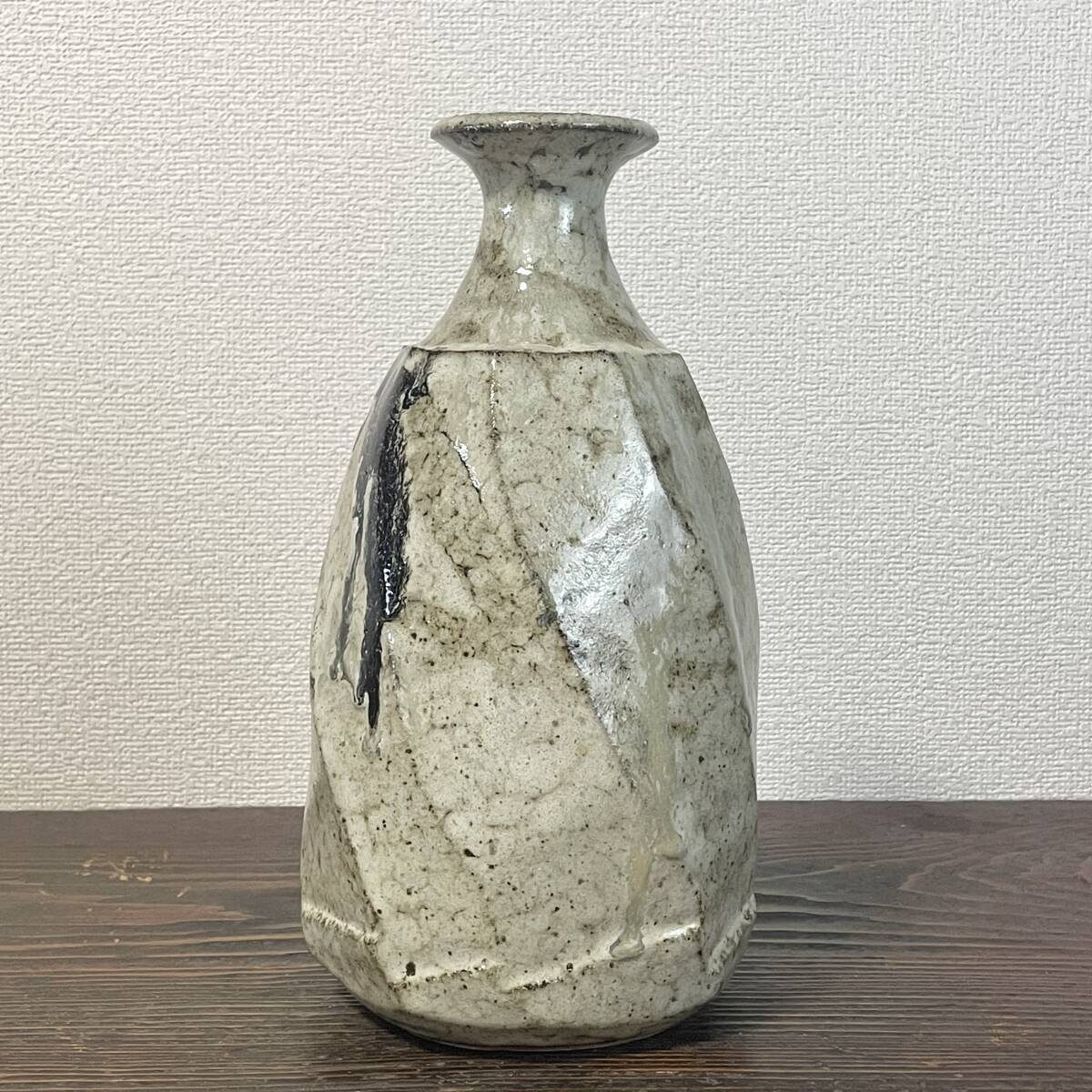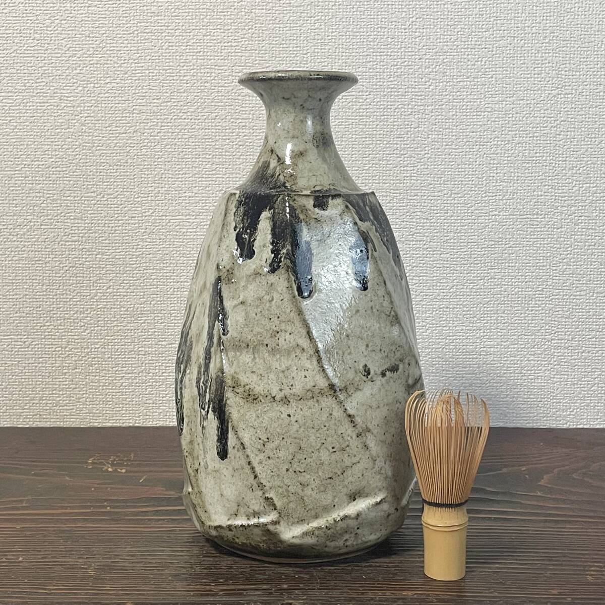 民藝 白釉 重厚な面取壺 糠釉 黒釉掛け 捻り面取 大徳利 花瓶 検)朝鮮唐津 丹波焼 生田和孝