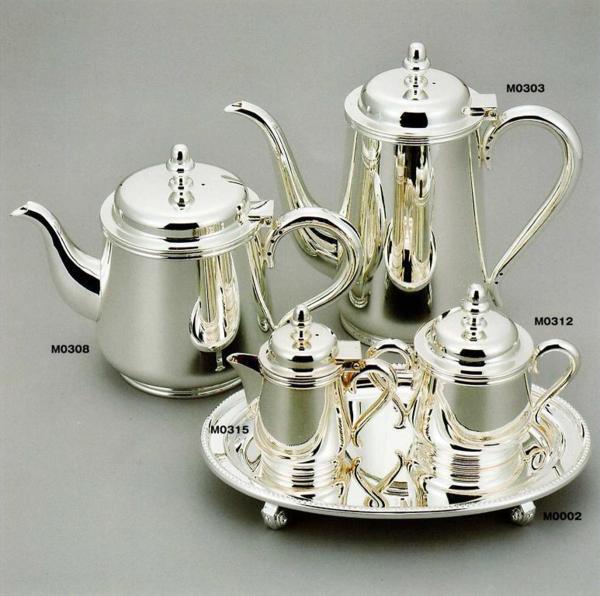 ★早川シルバー洋白銀器VIPM型コーヒーポット・ティーポット・シュガーポット・ミルクポット・足付小判トレー5点セット日本製新品