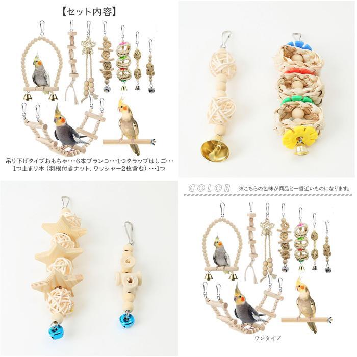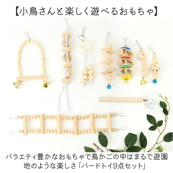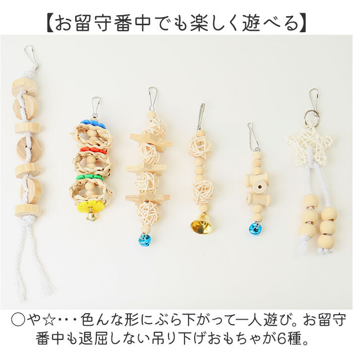 商品説明 | ・・【小鳥さんと楽しく遊べるおもちゃ】 ・バラエティ豊かなおもちゃで鳥かごの中はまるで遊園地のような楽しさ「バードトイ9点セット」 ・【小鳥の好奇心を刺激する知育玩具】 ・おしゃべりが得意で知能が高いオウムやインコ。小鳥さんのストレス発散やエクササイズに最適。 ・【お留守番中でも楽しく遊べる】 ・〇や☆・・・色んな形にぶら下がって一人遊び。お留守番中も退屈しない吊り下げおもちゃが6種。 ・【にぎやかな音色が耳に心地よい】 ・吊り下げおもちゃ先には涼やかな音色を奏でる鈴やベル付き。ぶら下がるたびに鳴る音も楽しい。 ・【ゆらゆらブランコがお気に入り】 ・いっぱい遊んだ後はゆらゆら揺れる特等席でリラックス。ブランコが一番のお気に入りの場所。 ・【タラップはしごで自然に運動】 ・ケージの両端につないだらトコトコ歩いてエクササイズ!ハンモックみたいにゆったり設置もOK! ・【止まり木でホッとひと休み】 ・遊び疲れたときにひと休みできるシンプルな止まり木付き。行ったり来たりしても楽しい♪ ・【取り付け簡単、しっかり安定】 ・吊り下げおもちゃやブランコは、鳥かごの天井からナスカンフックで簡単に固定が可能。 ・【小鳥に優しい天然素材】 ・天然の木材やコットンロープ、ラタンなどの植物素材なので、小鳥が舐めたりかじっても安心。 ・【一緒に遊んでコミュニケーション】 ・普段お留守がちな飼い主さんとのコミュニケーション不足解消や、運動不足解消にオススメ! ・【セット内容】 ・吊り下げタイプおもちゃ・・・6本 ・ブランコ・・・1つ ・タラップはしご・・・1つ ・止まり木(羽根付きナット、ワッシャー2枚含む)・・・1つ |