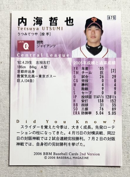 2006 BBM Baseball Cards 2nd version #675 内海哲也 読売ジャイアンツ/読売巨人軍 | |||