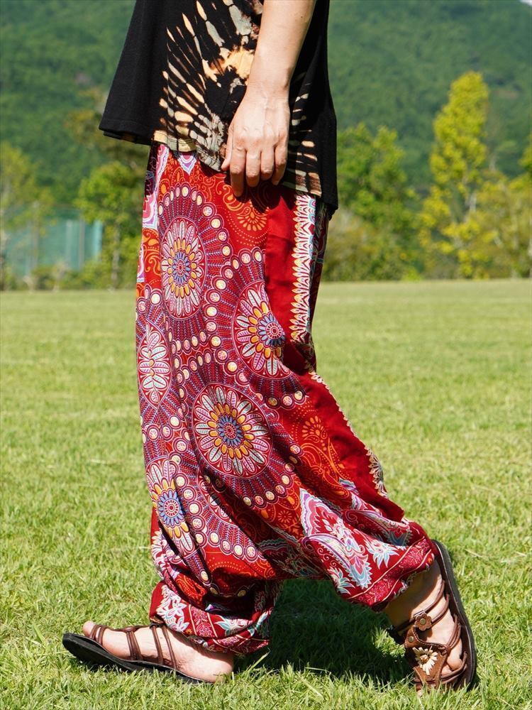 キレイな色使いと、オリエンタルな雰囲気のマンダラ柄が素敵なサルエルパンツ♪お腹やヒップ・足元まですっぽり!体型やサイズ感を気にせず楽しめるゆったり着心地のパンツです。すとんとした生地の落ち感やナチュラルなたわみが美シルエットを演出。素材にはさらっと風通しのいいレーヨン生地を使用、暑い時期は涼しくその他のシーズンもレイヤーアレンジでお楽しみ頂けます。ウエストはストレッチ抜群のシャーリング仕立て、ユニセックス使いも◎暑い時期はサロペットとして2Wayアレンジもぜひお試しください。