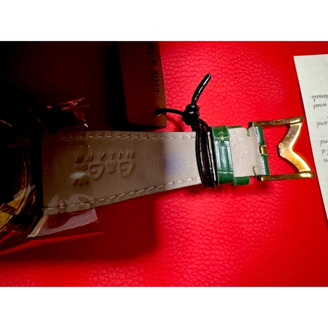 素材 ステンレススチール/レザー/ステンレススチール サイズ ケース:約48mm仕様 ムーブメント:手巻き 文字盤カラー:グリーン付属品保存箱 状態・コンディション 状態ランクSA 使用感の感じない新品同様の美品です。写真の様にベルト内側に汚れ箇所があります。