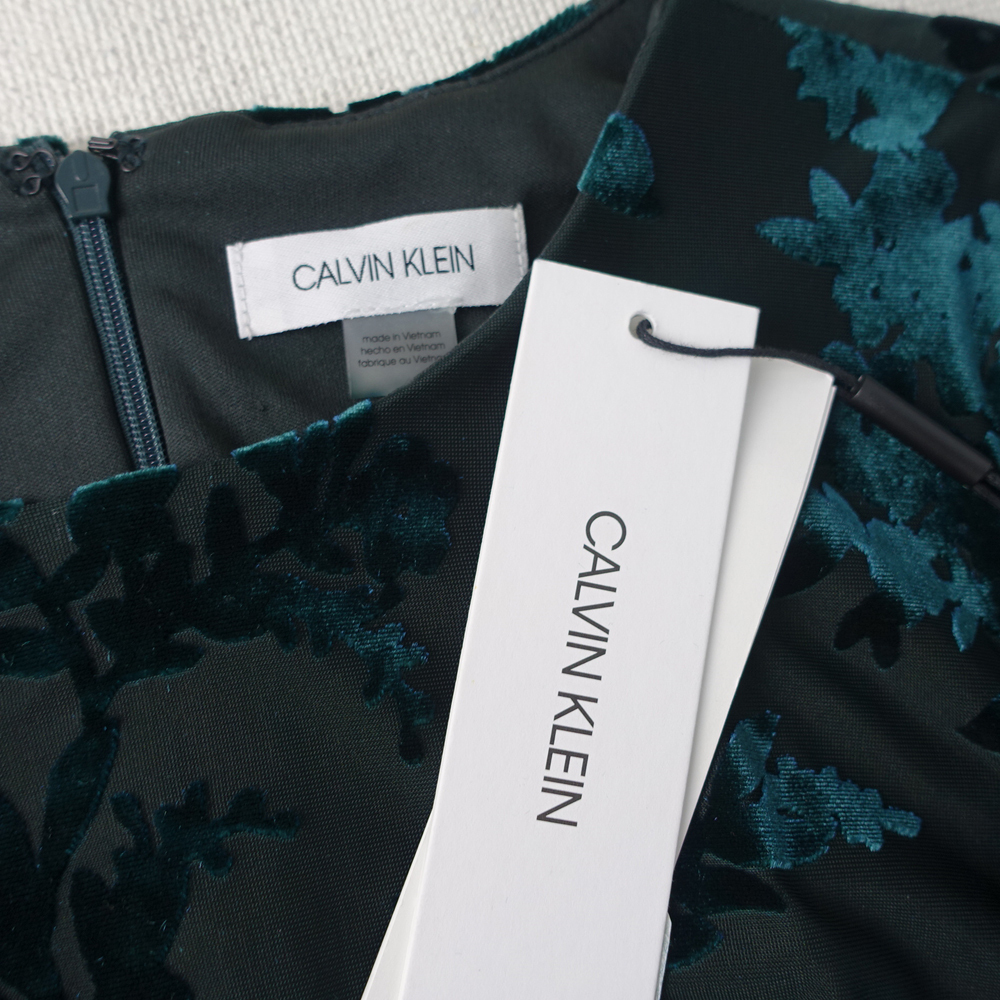 送料230円 新品カルバンクライン 4/9号 緑 フロッキープリント 半袖 ワンピース パーティ ドレス 結婚式 同窓会 華40N1802