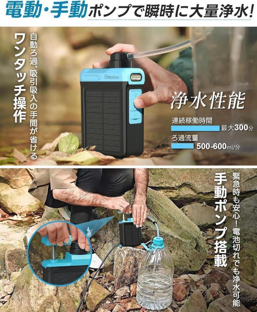 Greeshow 携帯浄水器 アウトドア 浄水器 電動浄水器ソーラー充電可能 濾過器 飲み水 災害 防災士推奨 サバイバル浄水器 スマホ充電機能 高輝度LEDライト付き SOSモード 緊急停電対策 防災グッズ