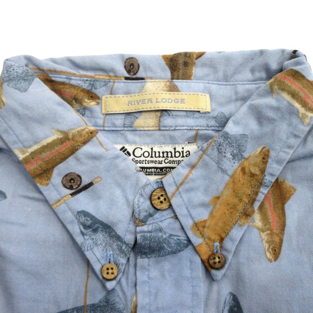 良品 Columbia RIVER LODGE コロンビア リバーロッジ フィッシュ パターン シャツ さかな柄 魚 半袖 XXL オールド ヴィンテージ 青