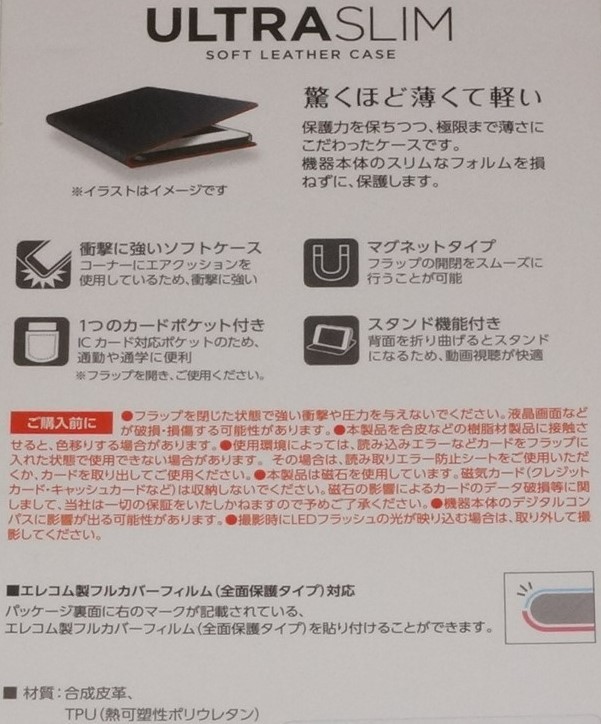 本体の薄さ、軽さを損ねない薄型・超軽量なウルトラスリムタイプのソフトレザーケース(手帳型)です。