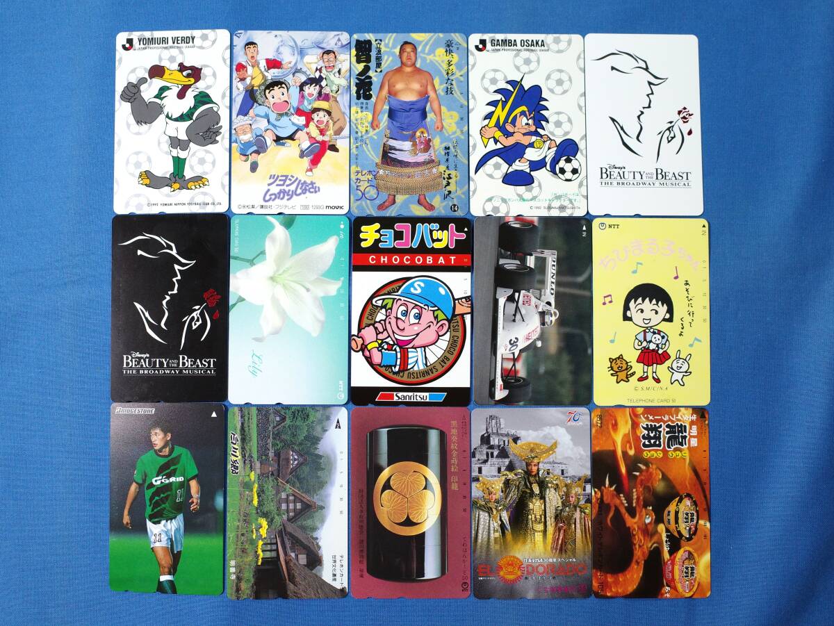 テレホンカード 未使用 15枚 (50度数 14枚、105度数 1枚) 8000円相当 | Jリーグ/三浦知良/チョコバット/ちびまる子ちゃん/宝塚/大相撲