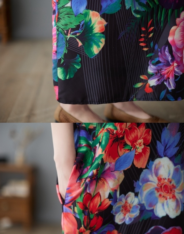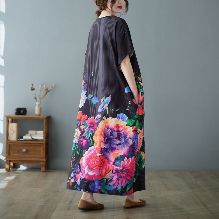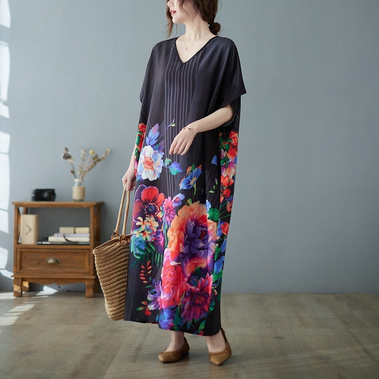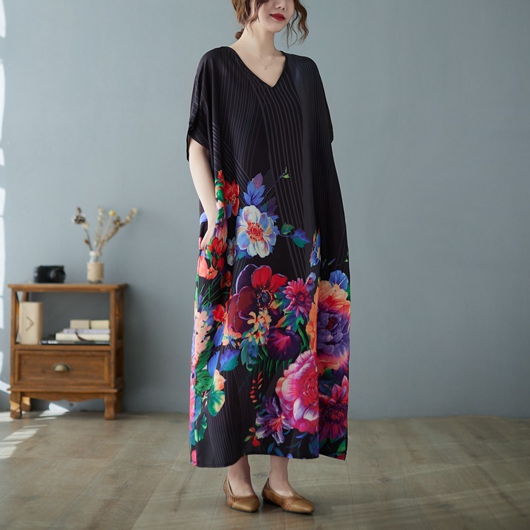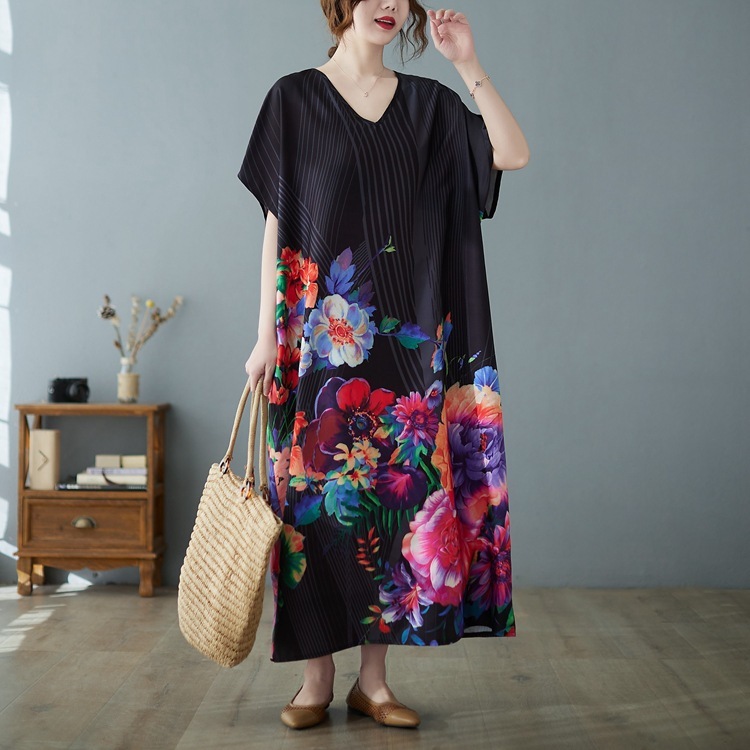 新作エレガント色鮮やかな和柄がおしゃれてろんとした素材のロング丈ワンピ 新品 大きいサイズ ゆったりVネックマキシ丈ワンピ