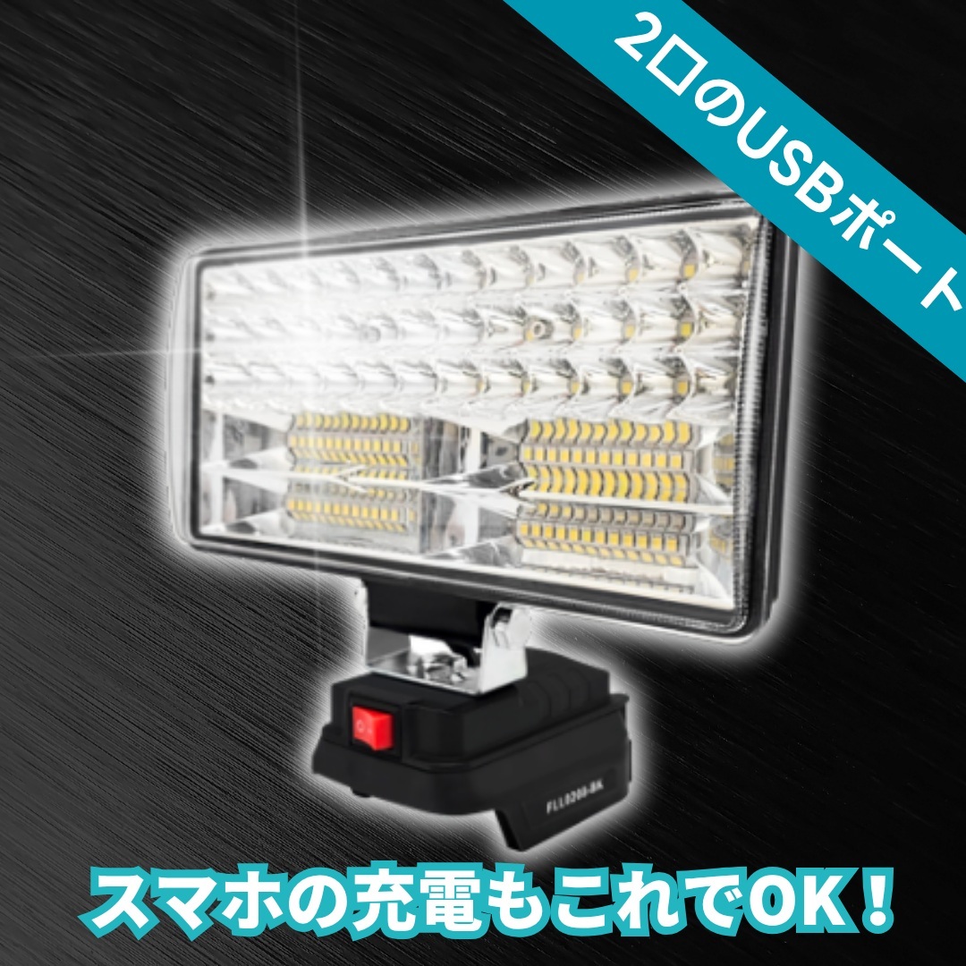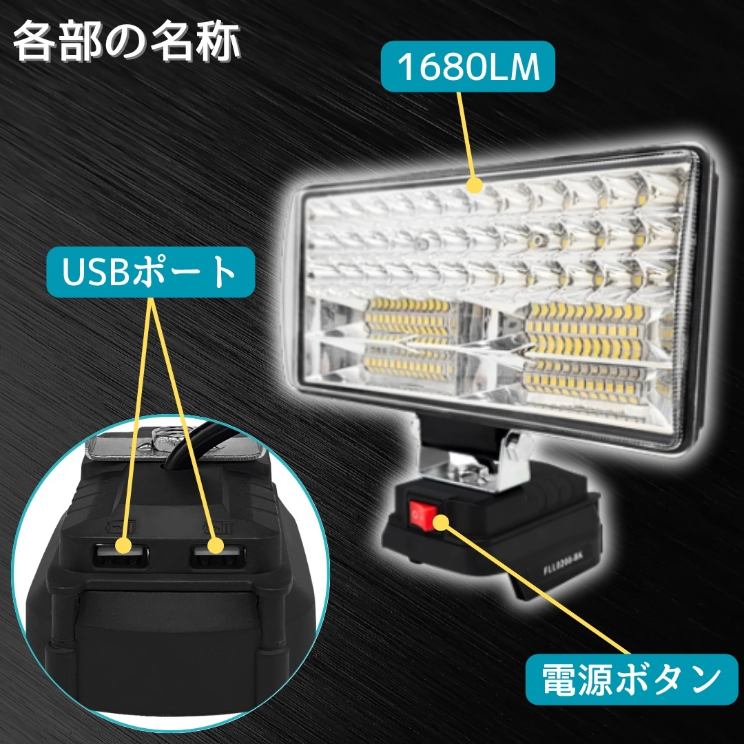 A マキタ 互換 充電式 1680ルーメン LED ワークライト 18V 14.4V 作業灯 投光器 2口 USB 搭載 現場作業 アウトドア 防災用(FLL0208-BK)