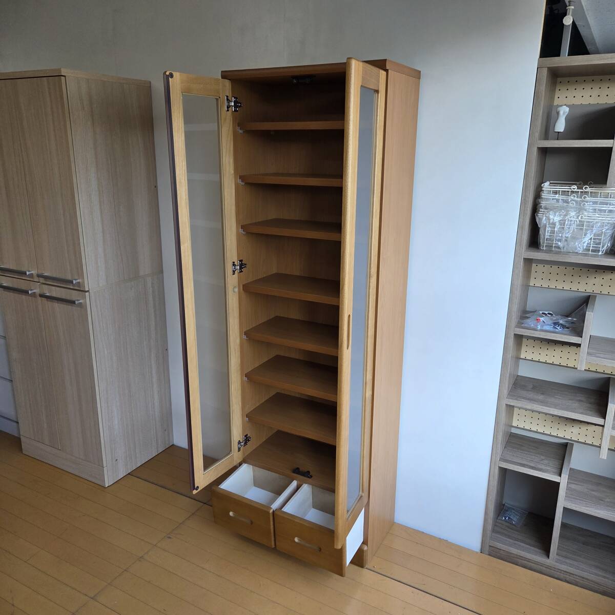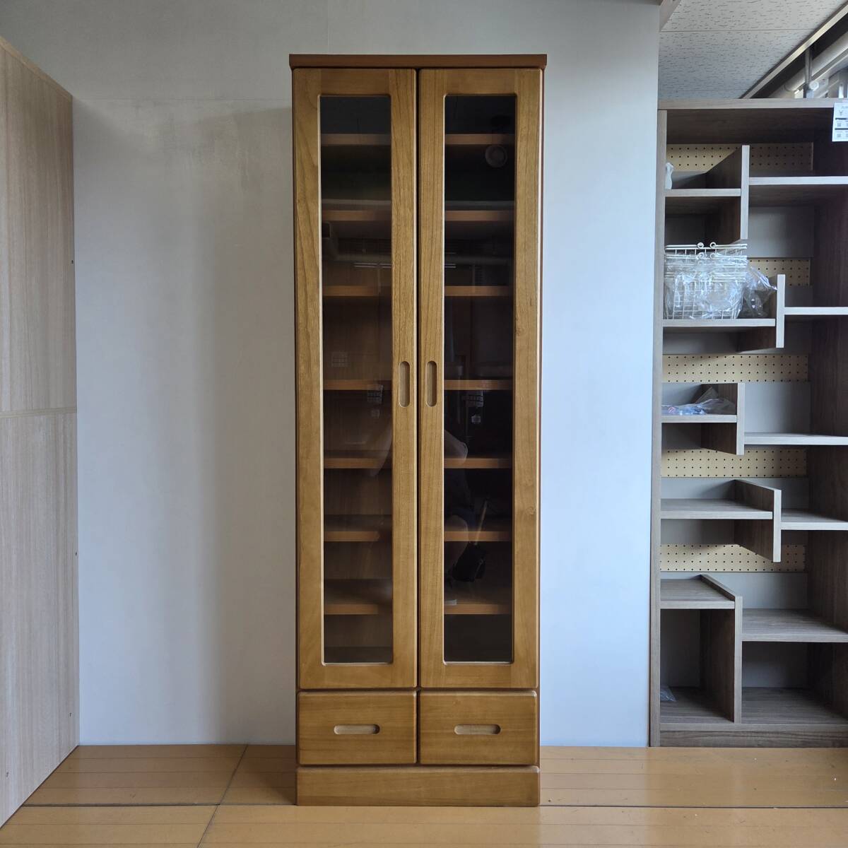 未使用訳あり 書棚 幅59.5 奥行31.5 高さ177.5 ナチュラル ガラスキャビネット 天然木 桐 桐材 リビングボード ガラス扉 引出し 収納棚