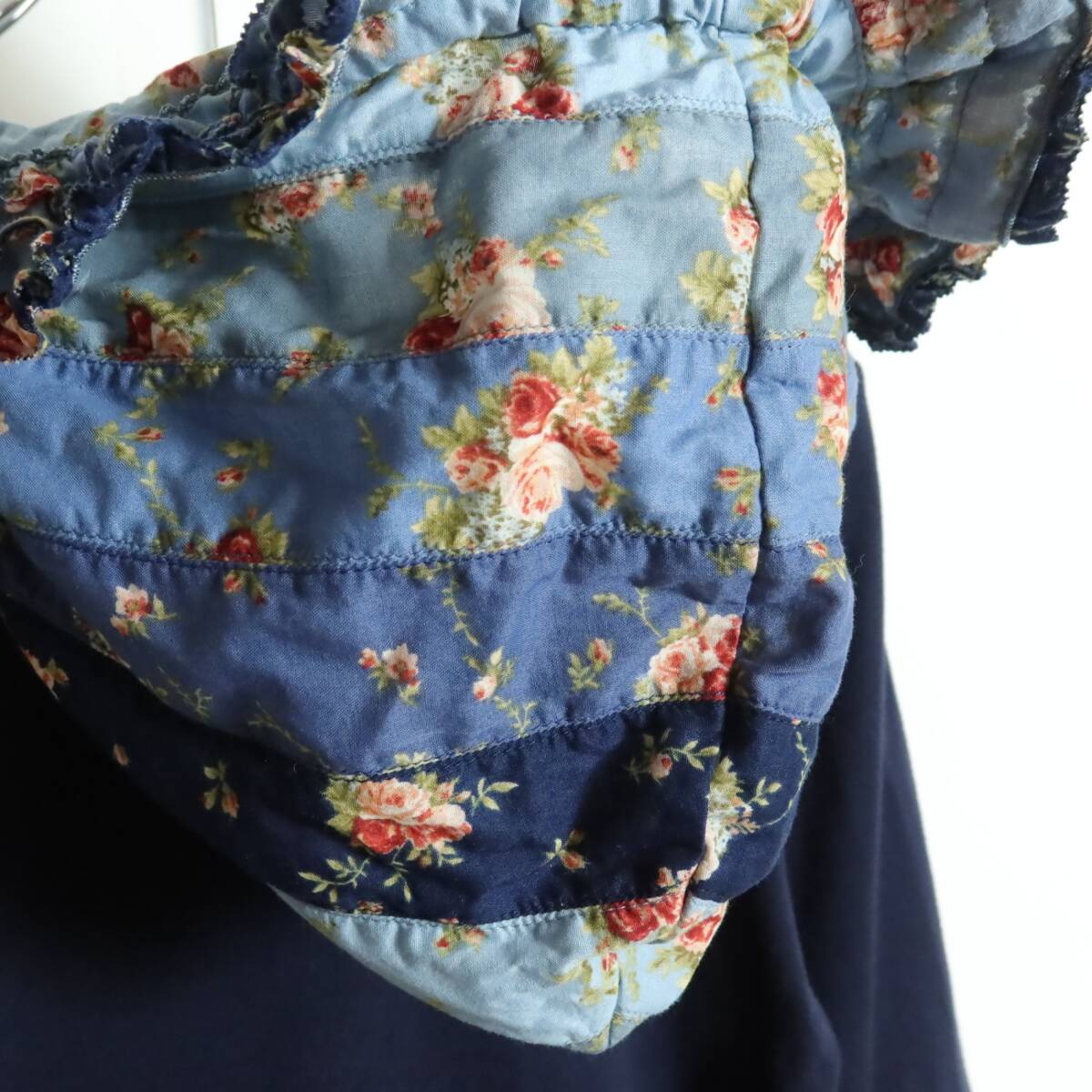 | 商品説明 |                  【実寸約】肩幅39袖丈60バスト92着丈56(cm) 【サイズ表記】 M 【素材】 綿100% 【状態】普通の使用感のあるお品物 【デザイン】ネイビー系 パッチワークのフードが付いた長袖カットソーです。 薄手/ローズ柄&無地 袖口に段々フリル付き  |