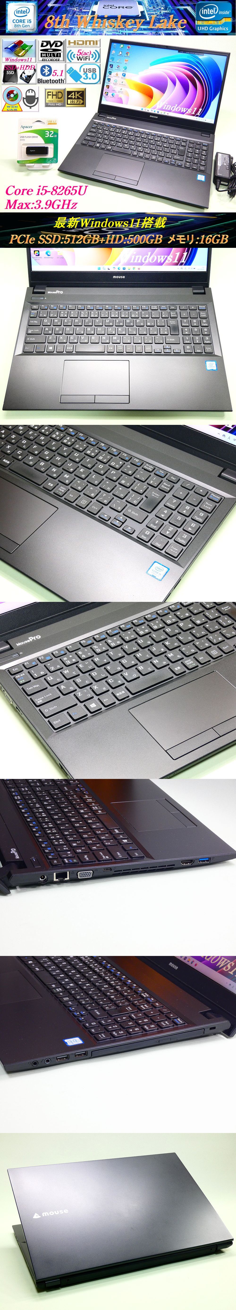 【特徴】:高性能、高速、多機能(内蔵3ドライブ仕様)パソコン -高年式2020年5月モデル →Windows11正式対応モデル -Windows11最新バージョン 24H2搭載 -インテル 第8世代CPU Core i5-8265U -インテル UHD グラフィックス 620 -大容量 SSD/512GB(M.2, NVME, PCIe) -大容量 HDD/500GB(SATA600) -DVDマルチドライブ -大容量 メモリ/16GB(DDR4-2666) -USB3.1 Type-C コネクタ -WiFi5(ac)対応&Bluetooth5.1 -オールセットアップ済。即使用OK!! →充実したマニュアルも標準添付 マウスコンピューターについて パソコン専門の国内製造のブランドで、高性能かつ高機能なパソコンの製作に定評があります。 基本性能の充実はもちろん、拡張性や音響、メンテナンス性など多角的な設計が高く評価されており、根強い人気を誇ります。 特に注目すべきトレンドは、拡張性を最大限に活かした「内蔵3ドライブ仕様」です。 これは高速なNVMe SSD、大容量のSATA バックアップ用途のHDDを組み合わせた構成で、パフォーマンスとストレージ容量の両立に加えディスク記録も可能にしています。 第7世代と比較して、CPU性能は約1.7倍に向上。処理能力が飛躍的に進化し、動画編集やゲームも快適に楽しめます。 さらに、PCIe対応の超高速SSDを搭載。OSやアプリをSSDに配置することで、起動時間を大幅に短縮し、複数のアプリを同時に使う作業もスムーズにこなせます。 加えて、高速DDR4メモリ(デュアルチャネル対応)を採用し、データ処理のさらなる高速化を実現。日常使いからクリエイティブな作業まで、あらゆるシーンで快適なパフォーマンスを発揮します。