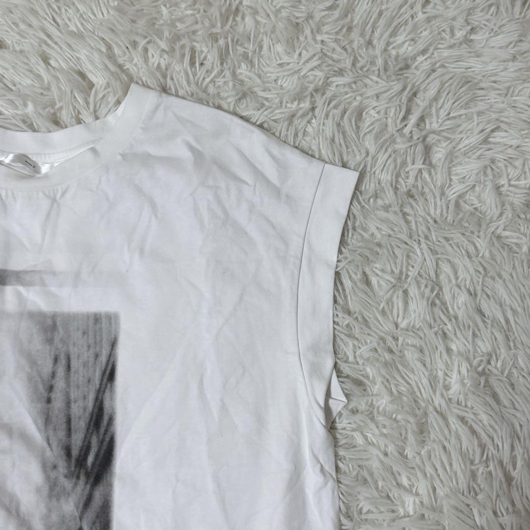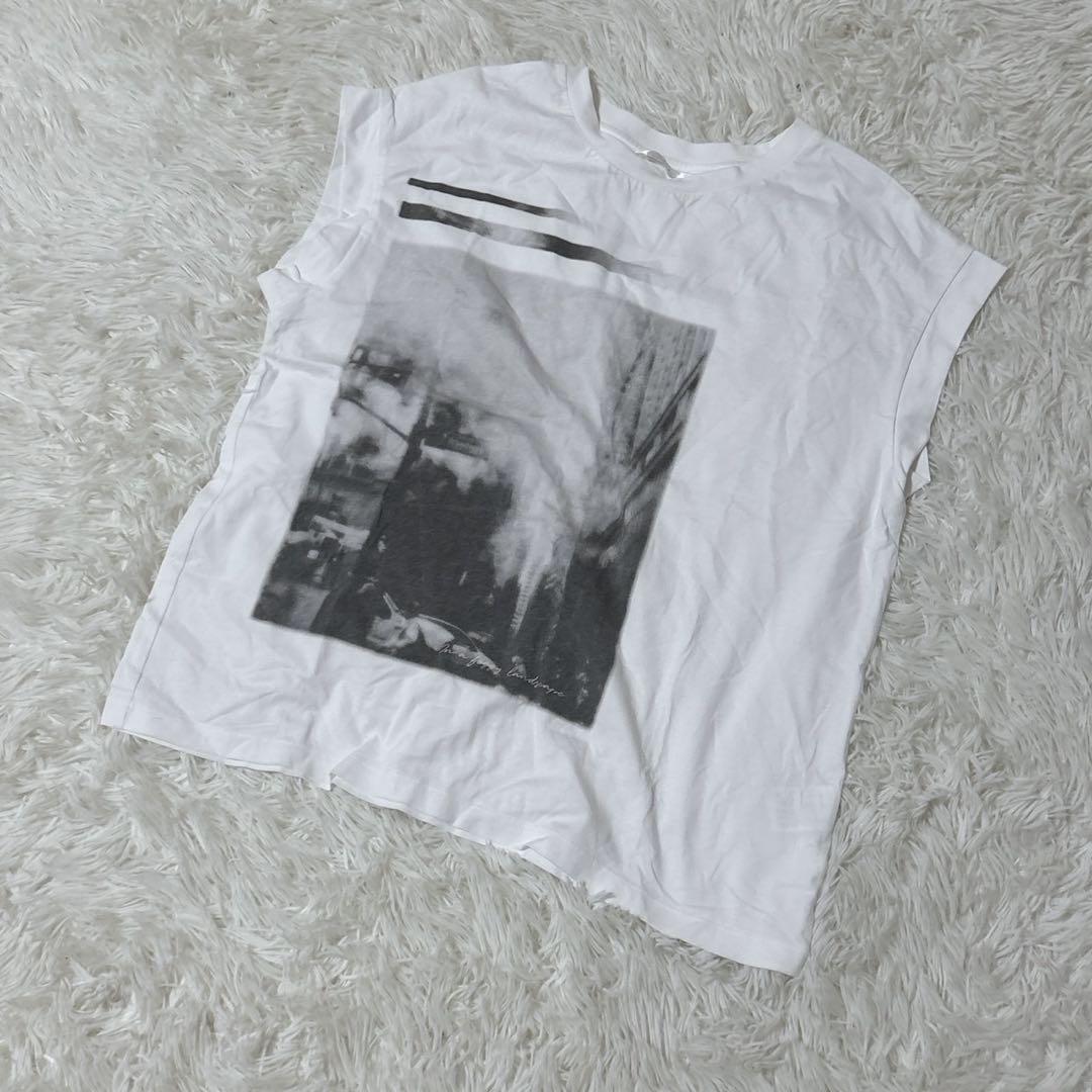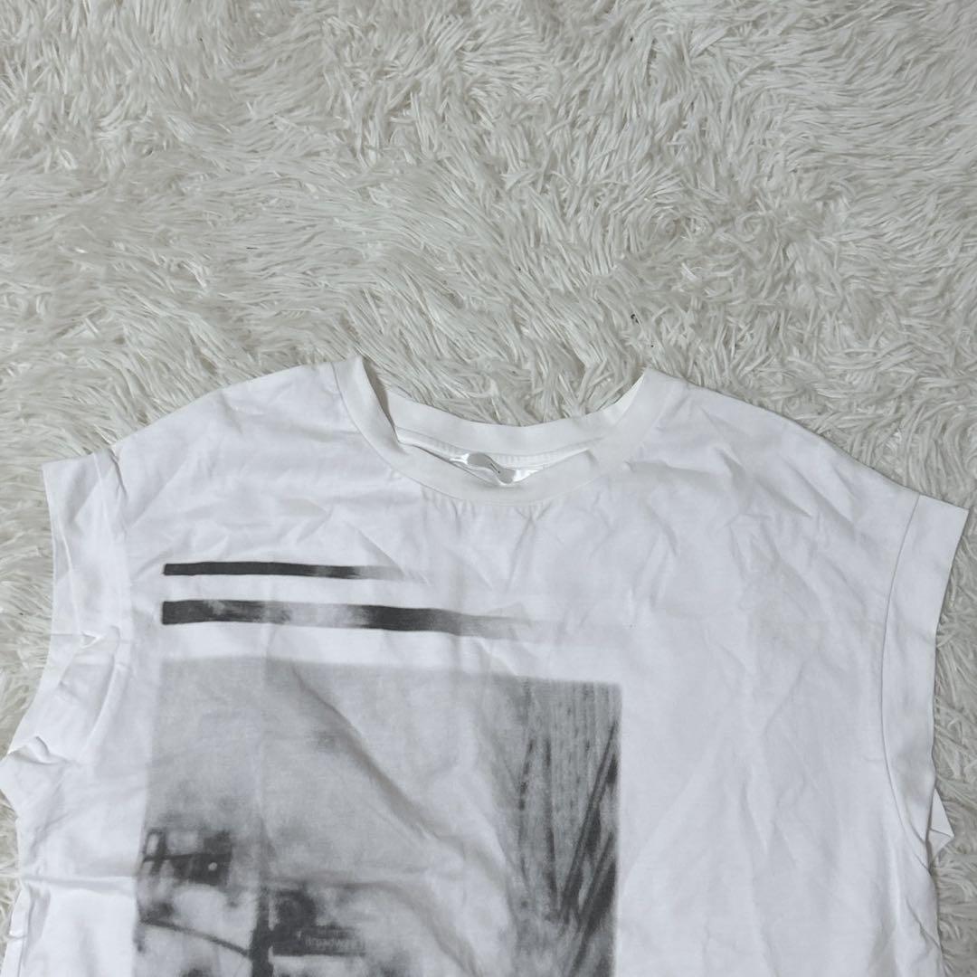 ホワイトのノースリーブTシャツ、グラフィックプリントデザイン。