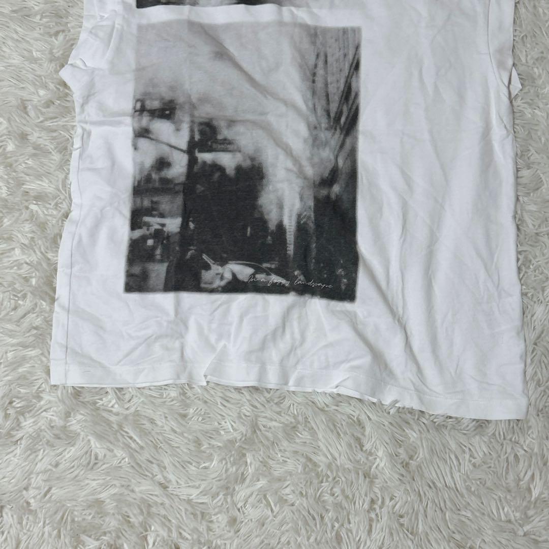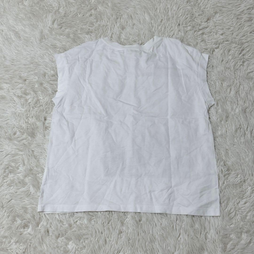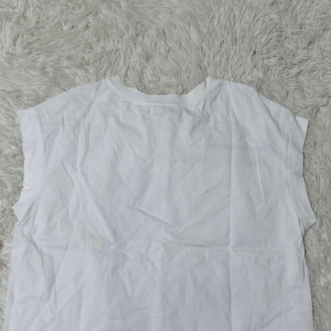 ホワイトのノースリーブTシャツ、グラフィックプリントデザイン。