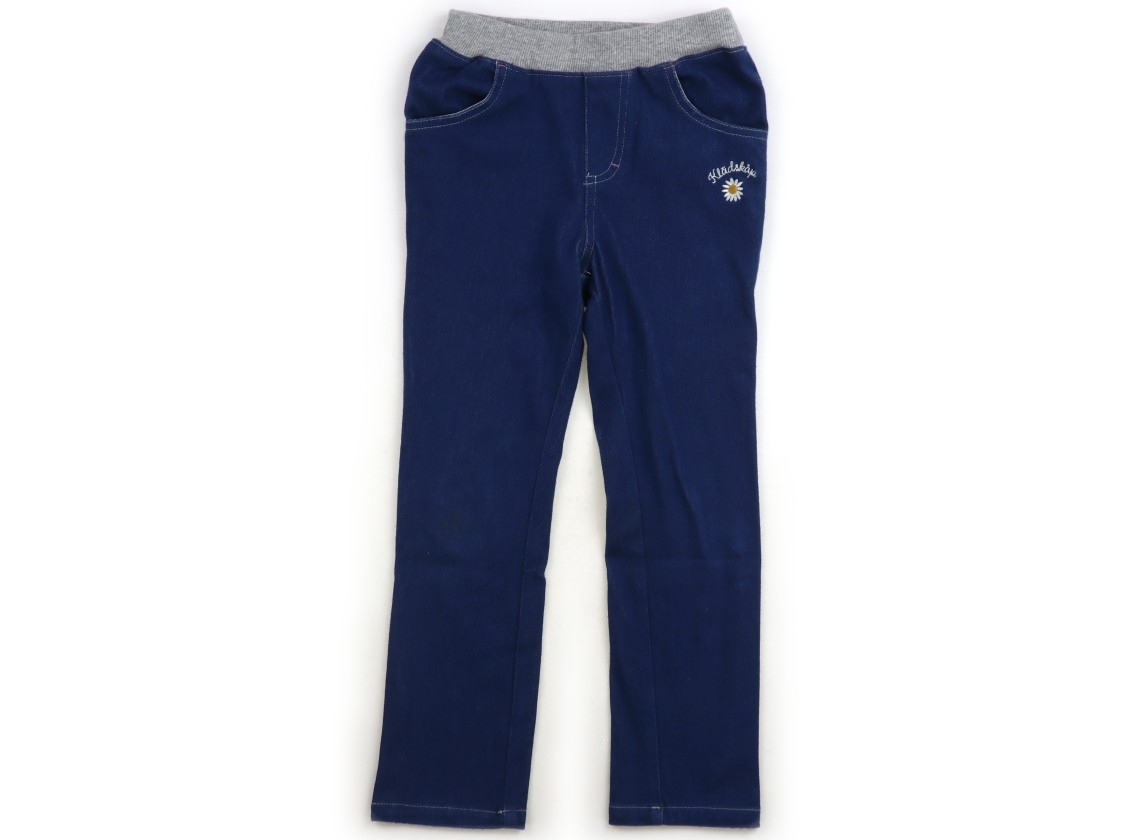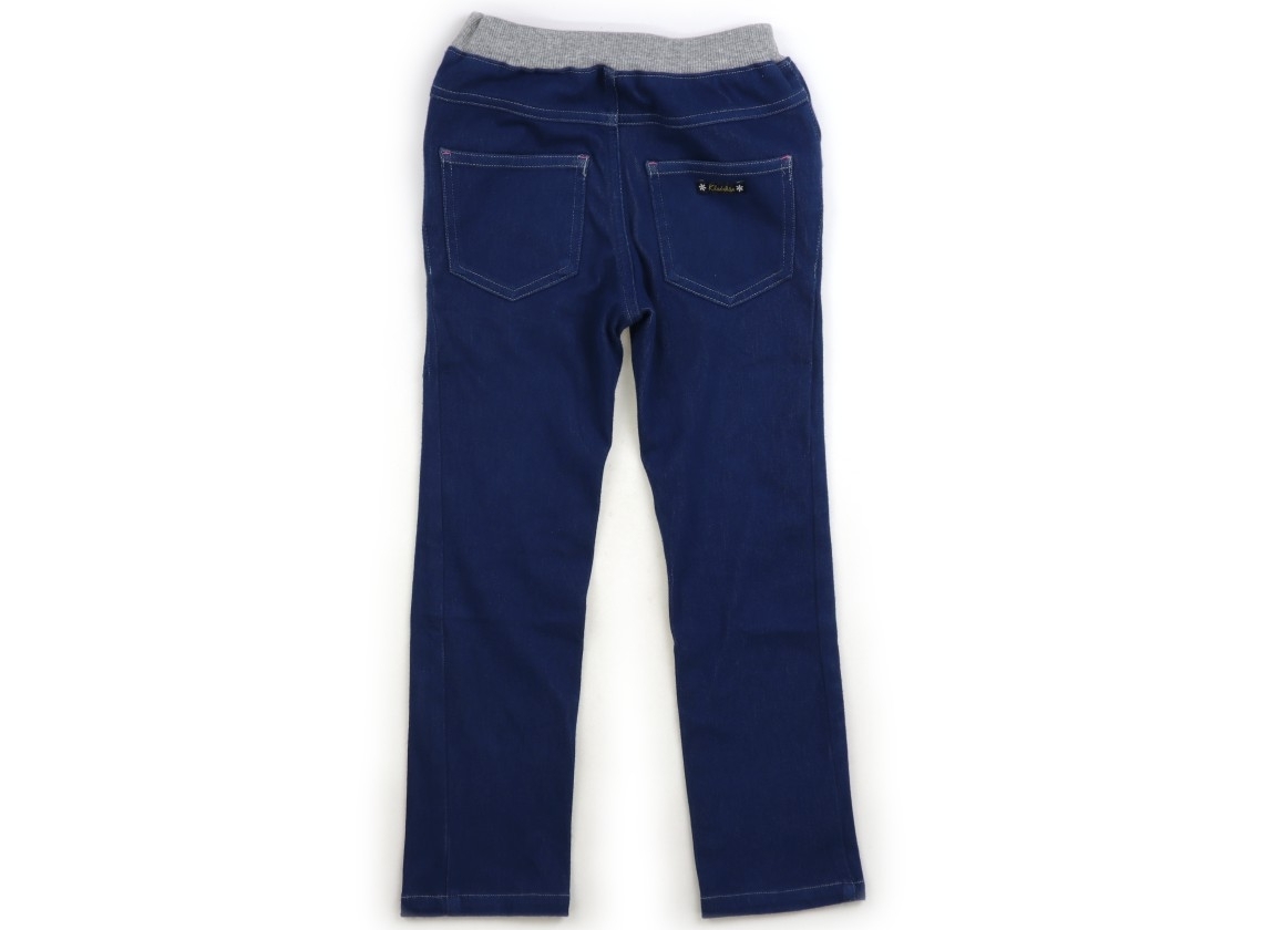 綿・ポリエステルのデニム風。ウエストはサイズ調整ゴムが付いています。全体的に毛羽立ちが強いです。両ひざ茶色く汚れています。外遊び用等にいかがでしょうか。
