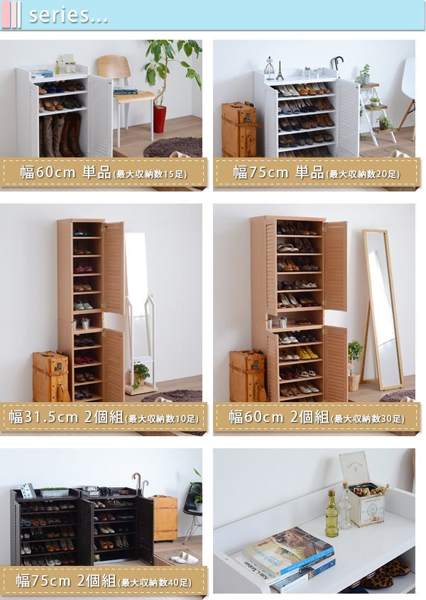 ※現在ご覧の商品ページはダークブラウンのご購入ページとなります。 ヤフオクの仕様上単一ページに複数バリエーションを掲載することができませんので、他バリエーションが希望の場合は別ページでご購入お願い致します。 本格的ルーバー扉を採用!ルーバーシューズボックスシリーズ。 2個セットで、横並びも縦積みもOK。 60幅タイプの2個セット ※撮影時の小物は付属しません。 配達業者を指定いただくことはできません。 沖縄・離島への配送は別途配送料が必要です。 ※別途送料が発生する場合は後ほどご連絡させていただきます。 タイミングによっては在庫切れの場合があります。