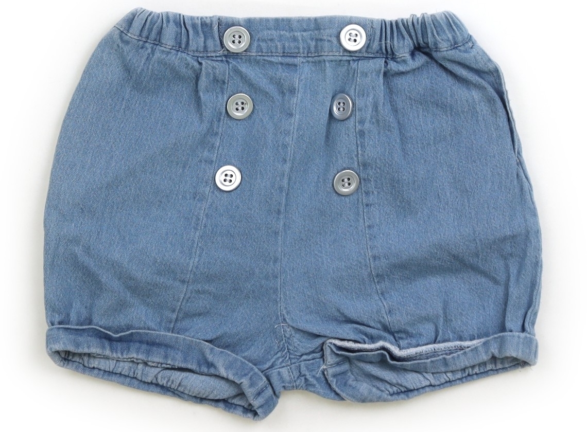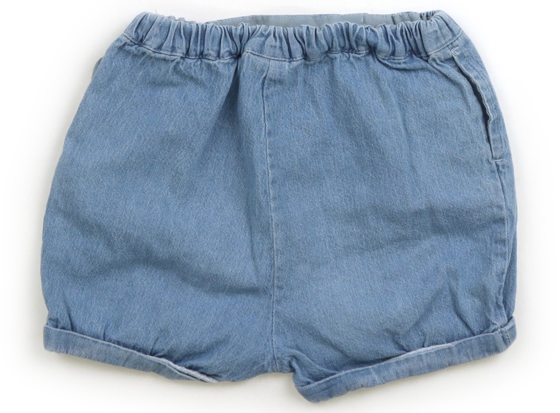 デニム生地です。ウエスト3/4ゴムです。裾折り返しにヨレがあり、縫い代が見えています。目立つ汚れはありません。