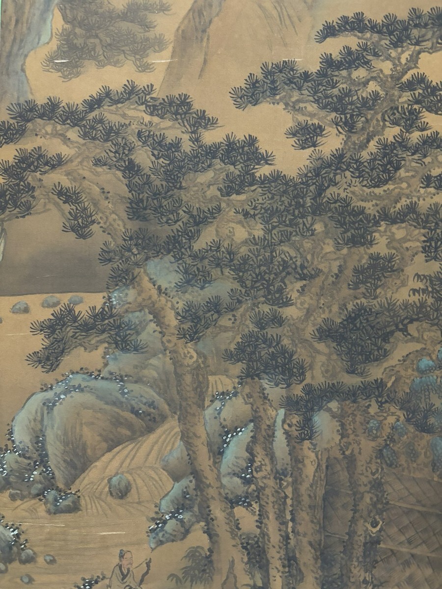 「趙雍畫 山水人家図」元代画家 肉筆絹本【仁】掛け軸 書画立軸 巻き物 中国書画 古美術 蔵出 畫芯約44×95cm