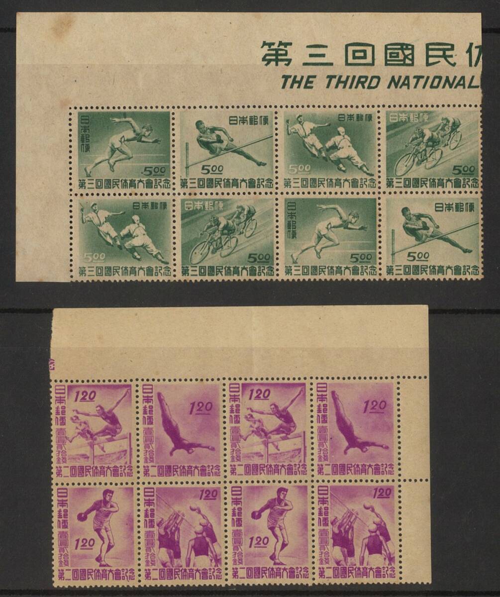 国体2回8枚ブロック、3回題字付8枚ブロック 未使用 シミ、ヤケ、折れ目有
