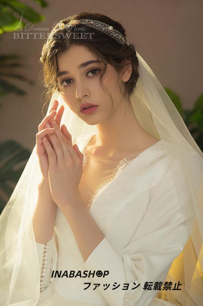 ウェディングドレス 長袖 Vネック ウエディングドレス トレーントレス Aライン レディースドレス 披露宴 結婚式 演奏会 海外挙式ドレス