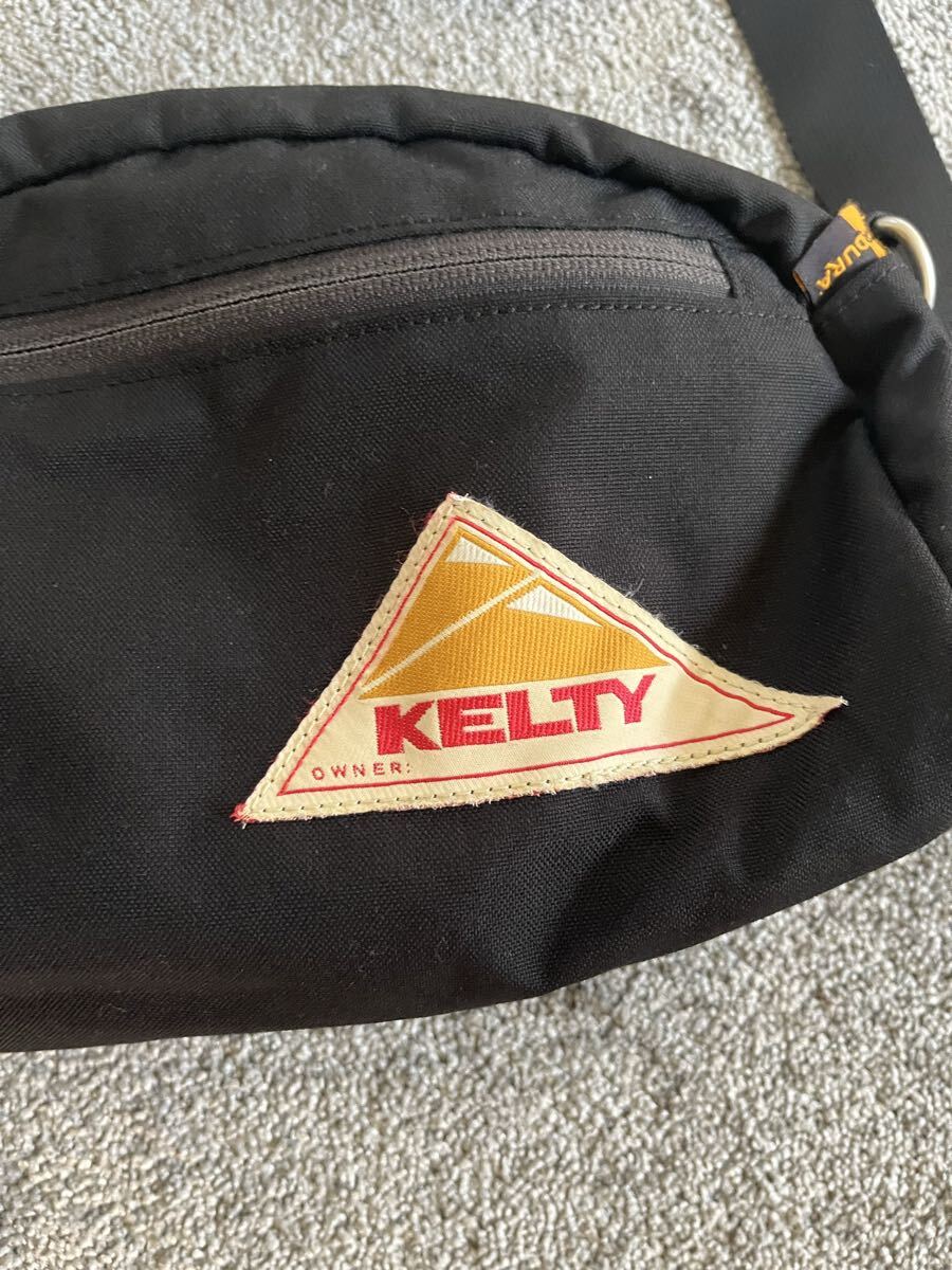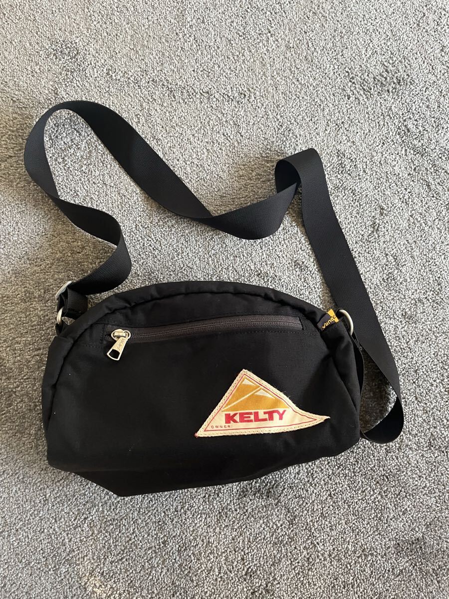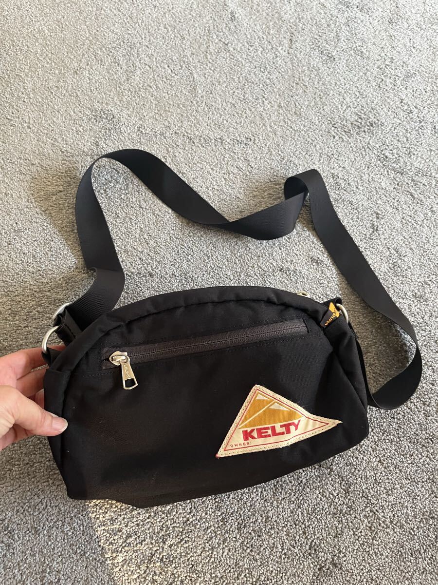 KELTYのブラックサコッシュ、調整可能なストラップとフロントポケット付き。