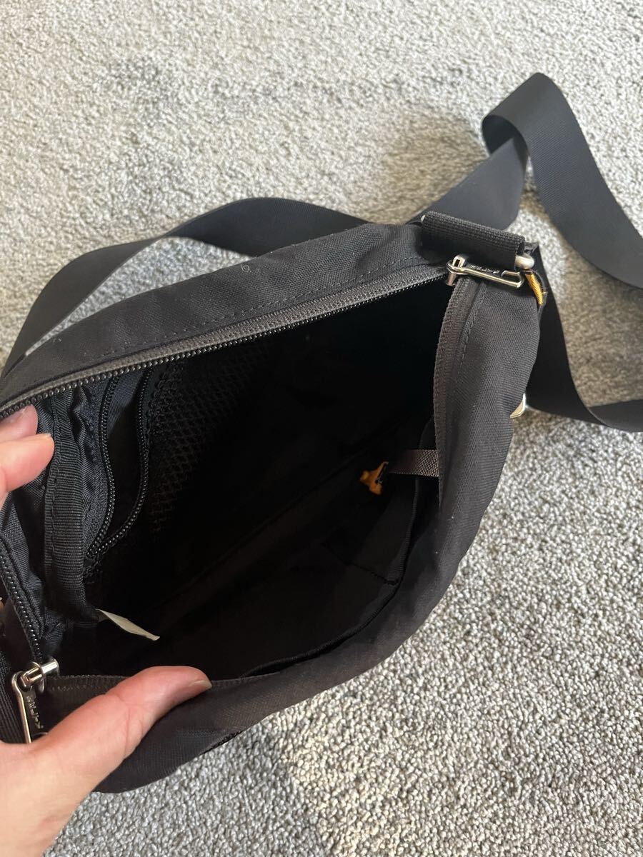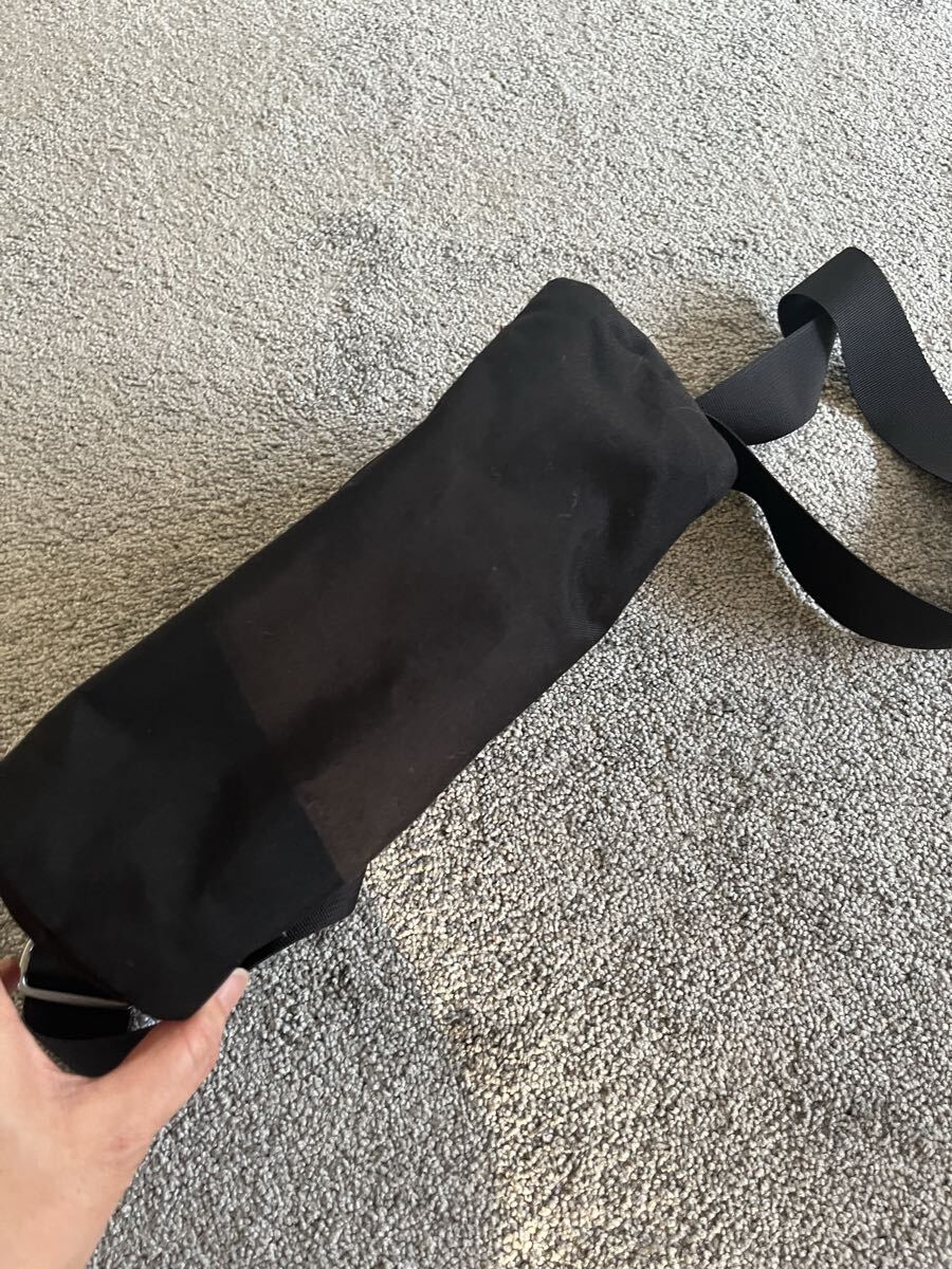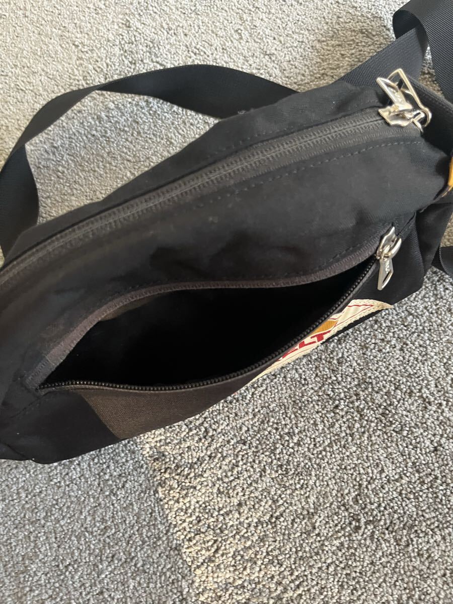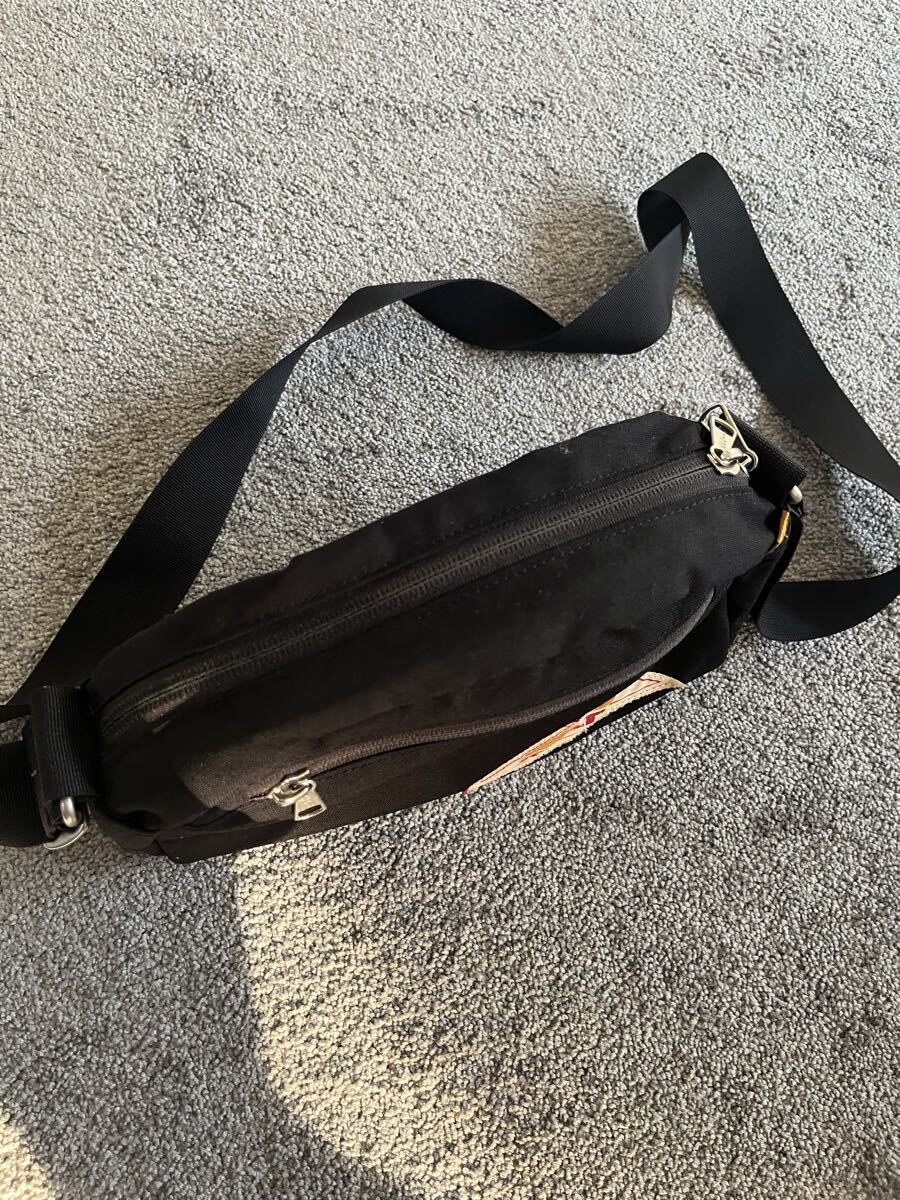 KELTYのブラックサコッシュ、調整可能なストラップとフロントポケット付き。