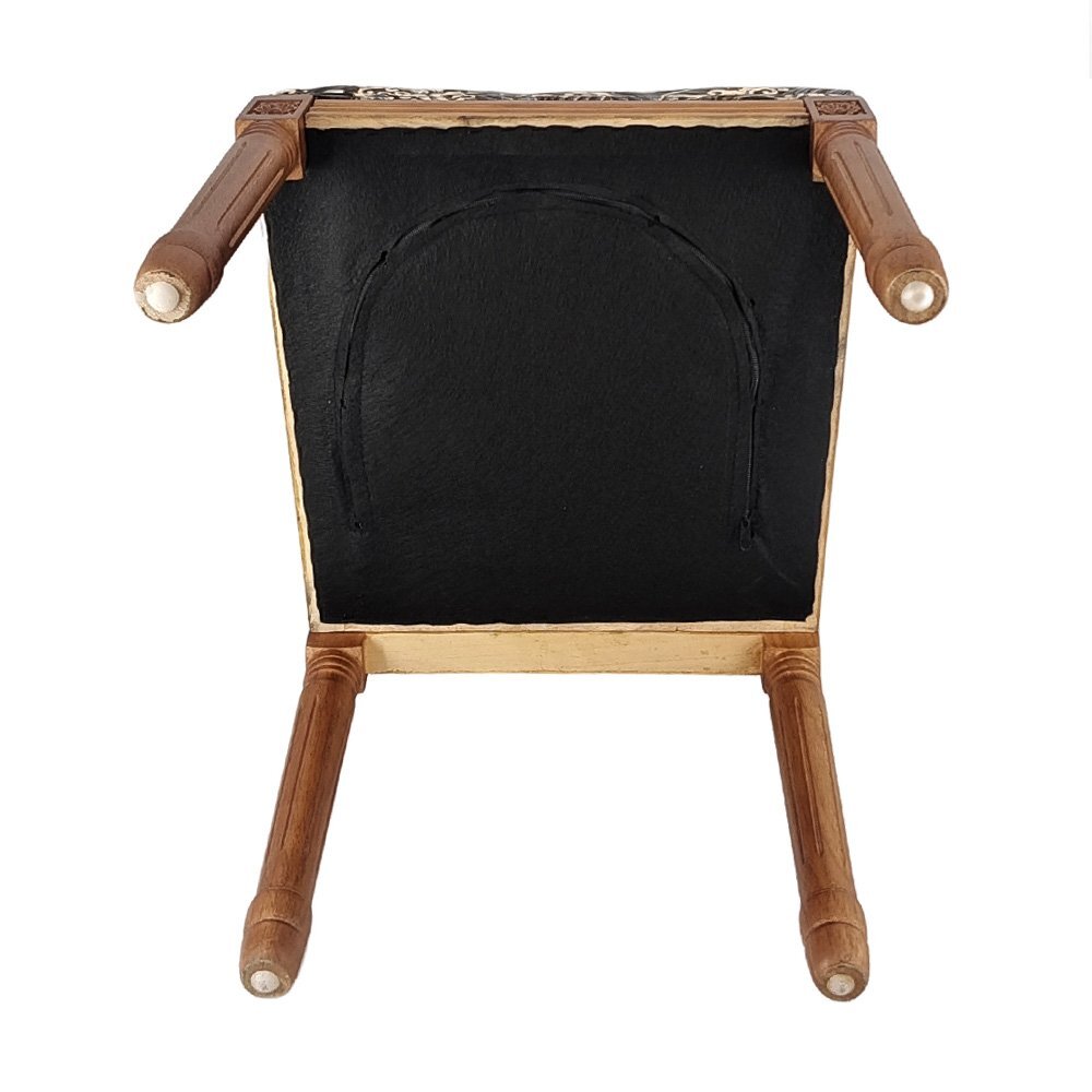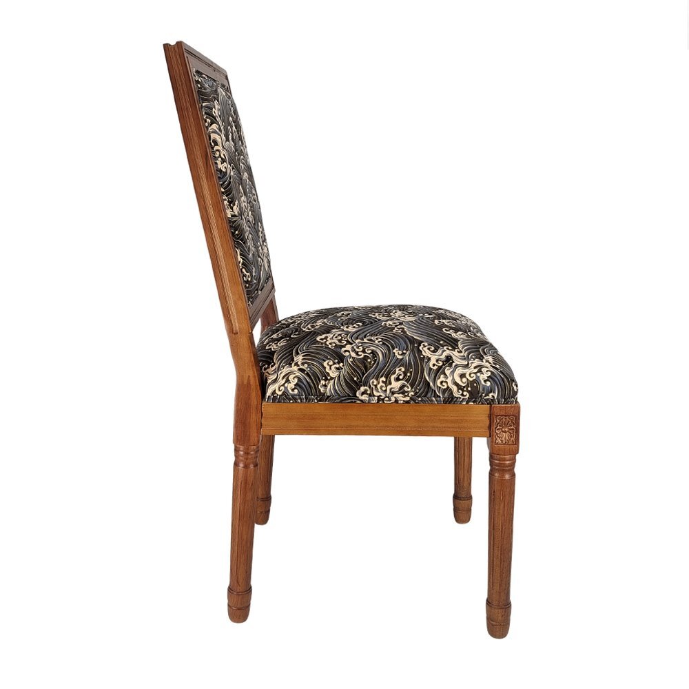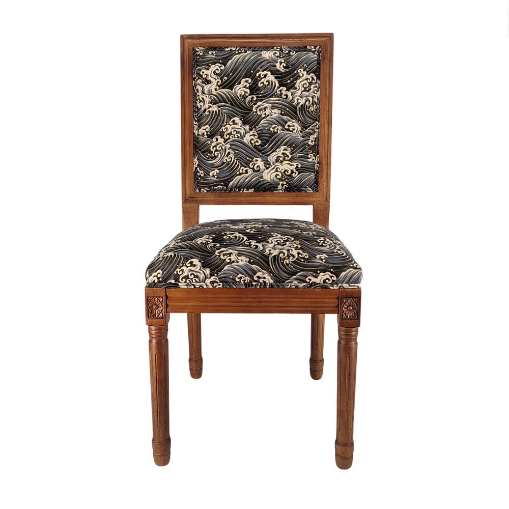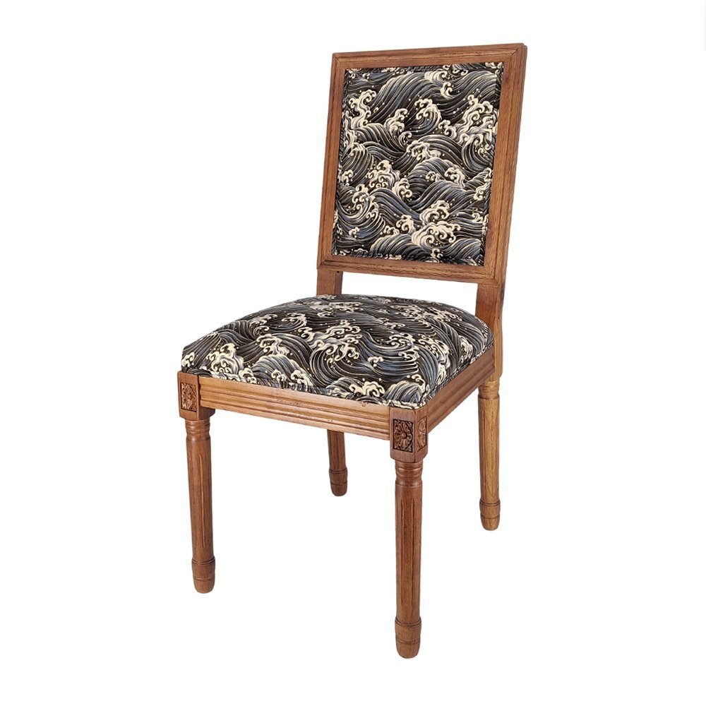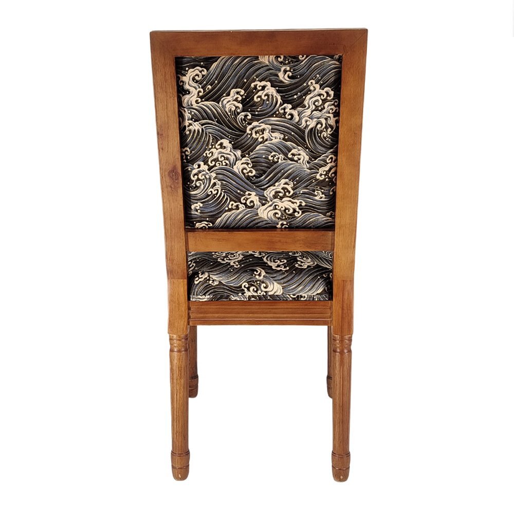 歴史長いアンティーク調のチェアがレトロな和柄の座面と背もたを加工します。