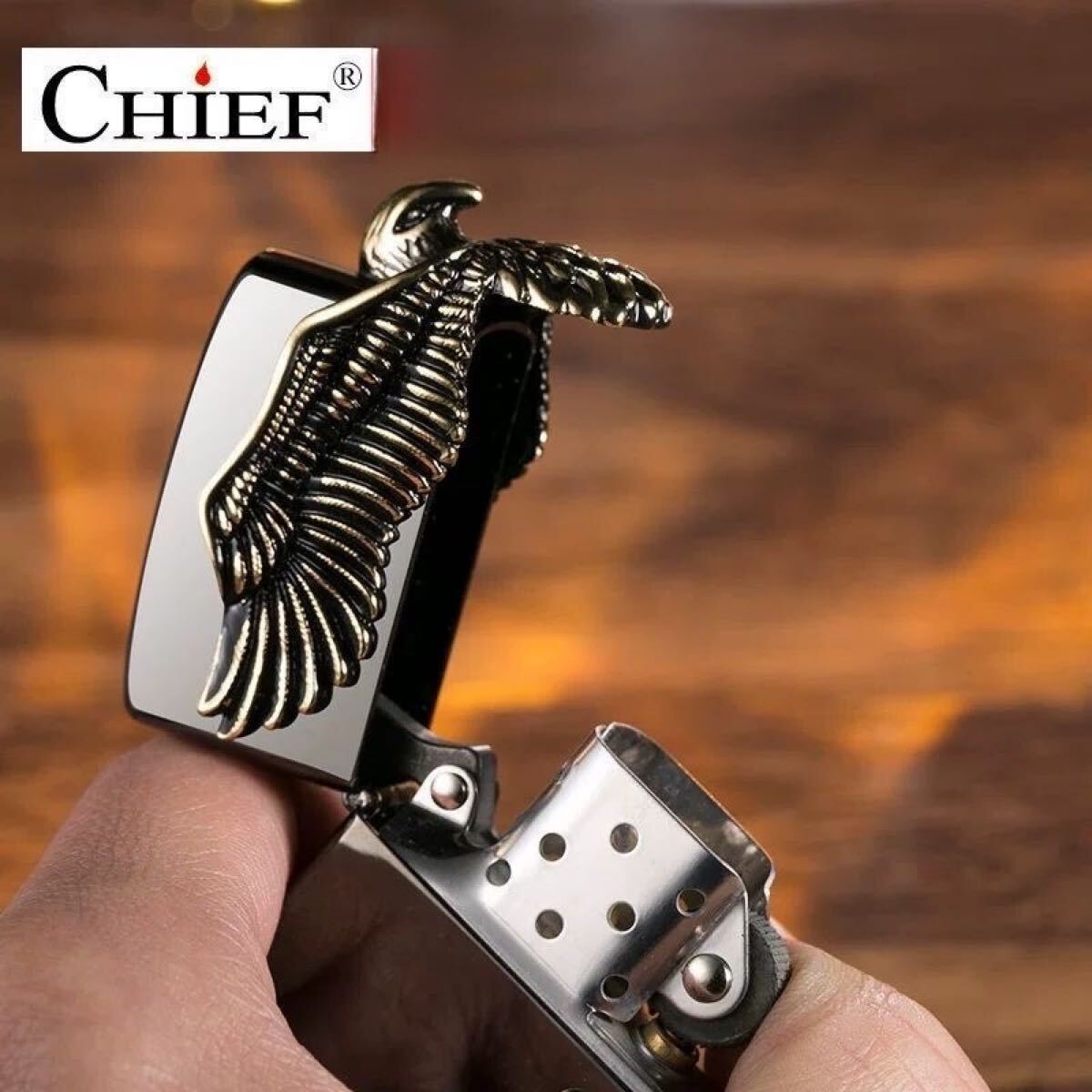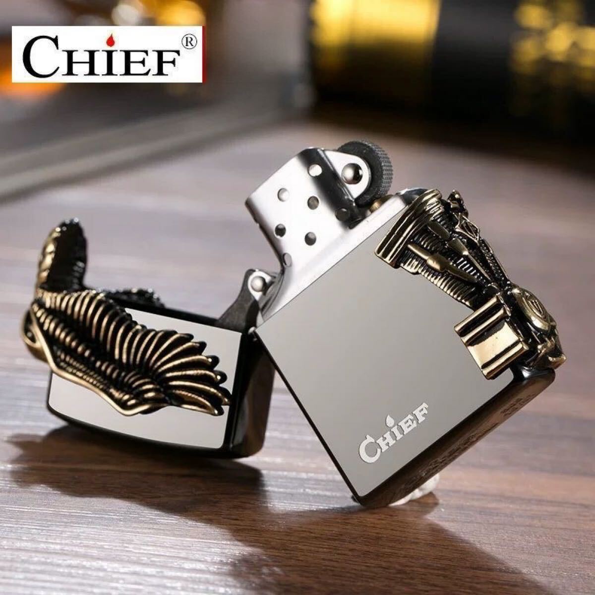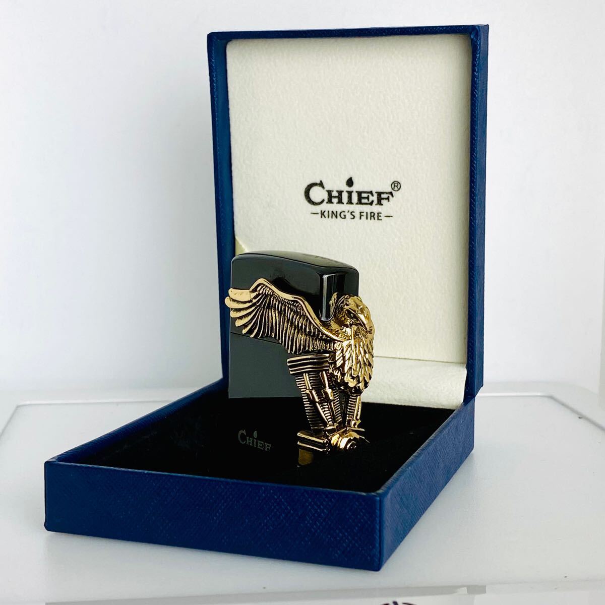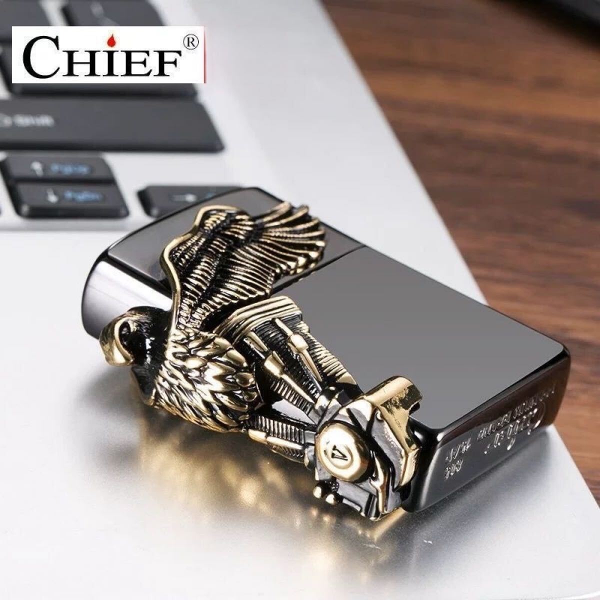 ハーレー愛好者にぴったりの逸品です。大胆かつ洗練されたデザインで、象徴的なイーグルが大きな翼を広げ、アメリカンバイク文化を象徴するモチーフが特徴です。ライターの正面には、まるでハーレーダビッドソンのエンジンを模した立体的な彫刻が施されており、精巧な細工が光ります。