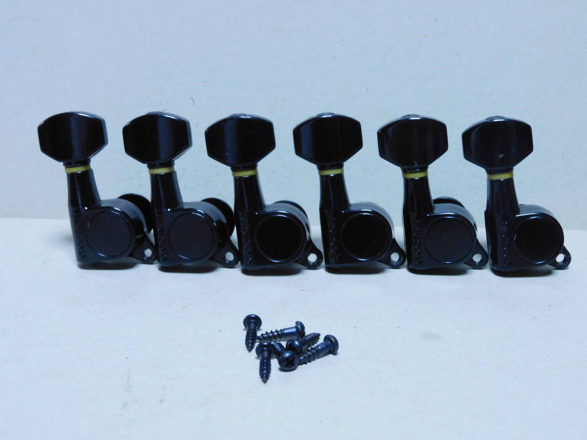 1980年代製「国産フェルナンデスorフェンダージャパン」のストラトキャスターに付いていた裏刻印なしの6連ペグ「GOTOH製/SG381/ブラック」です。現行品では本体裏に「JAPAN」の刻印がありますが80年代製には刻印がありません。製造年に拘りのある方にはお勧めです。年相応のブラックメッキの劣化や細かなキズ等はありますが割と綺麗です。点検済みで現状使用可能です。取り付け用ネジ6本付きです。状態は画像でご確認ください。当方にて出来るだけのクリーニングはしていますが必要なメンテナンスやクリーニングは落札者様でお願いします。画像にあるものが全てです。画像やコメントをご参考に入札お願い致します。それではオーションが終わりますまでよろしくお願い致します。中古点検品の為落札後のクレームやキャンセルはご遠慮下さい。またオークション開催中の入札の取り消しもお受け出来ません。あくまでも中古品なのでキズや経年劣化等些細な事や、完璧な商品をお考えの方は入札をお控え下さい。ご理解の上ご入札下さい。発送は「レターパックライト」で430円です。