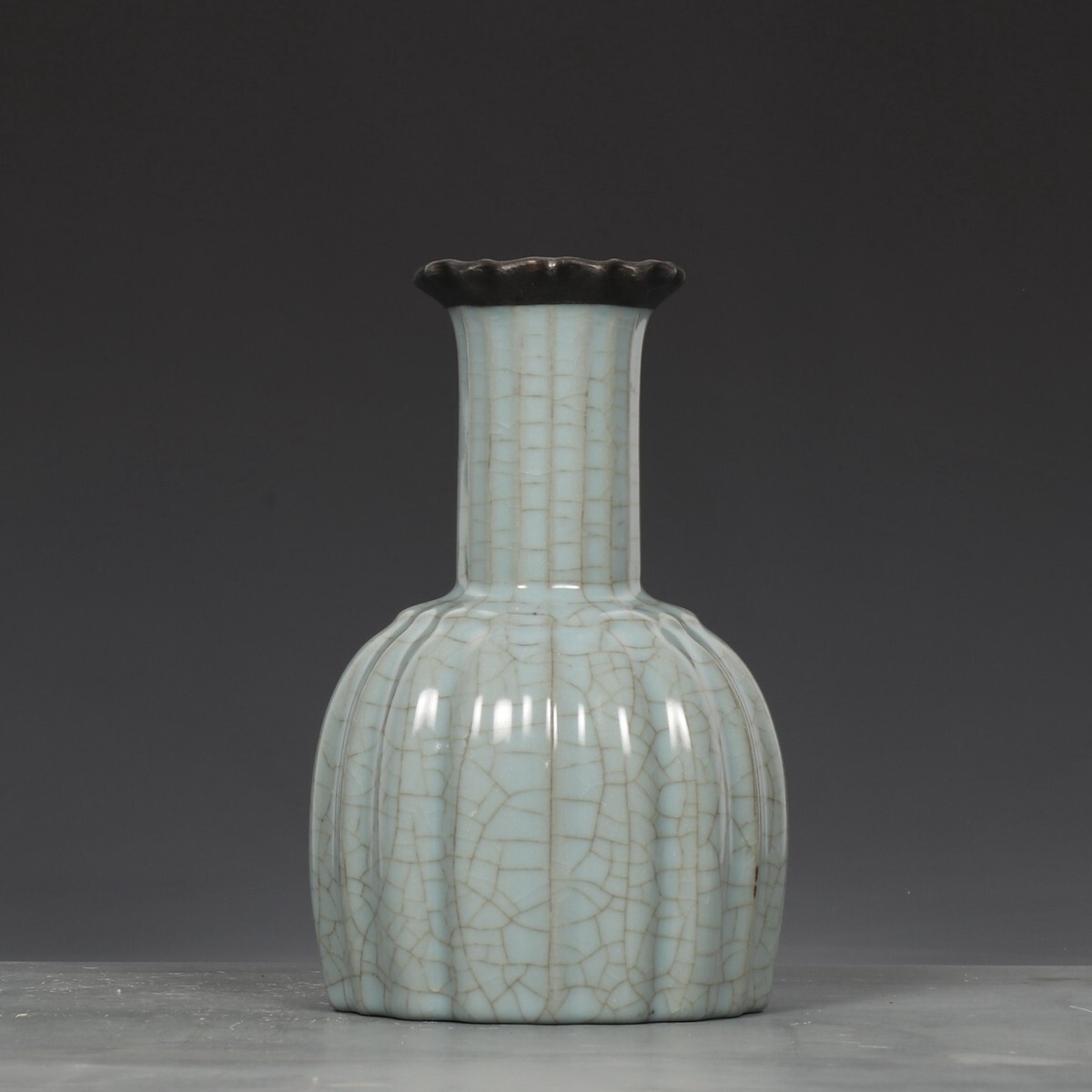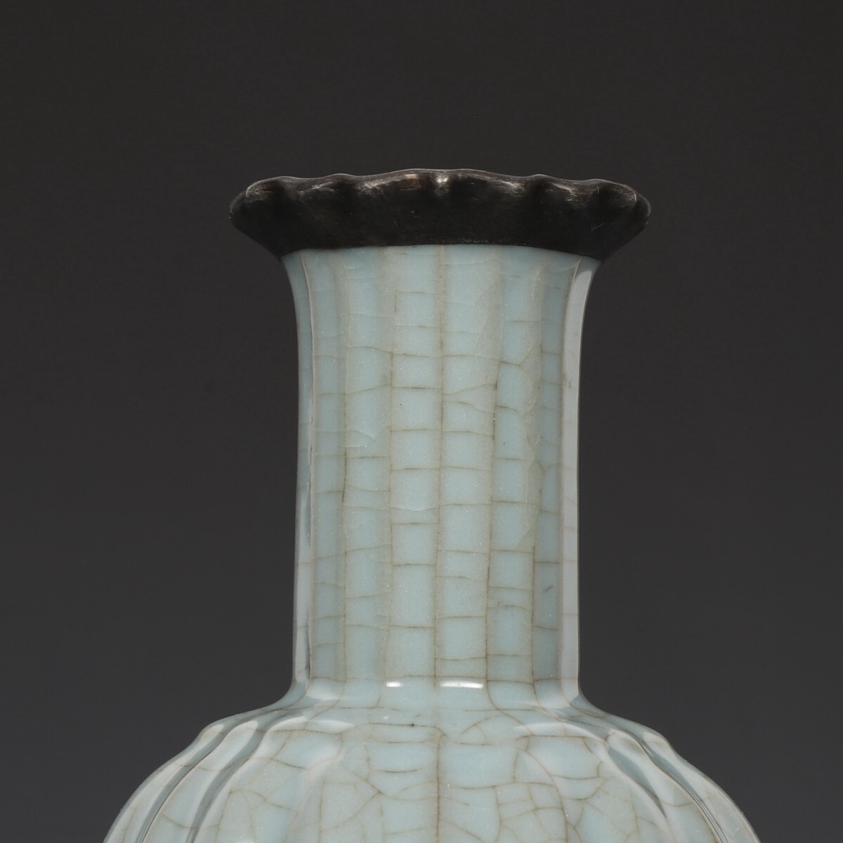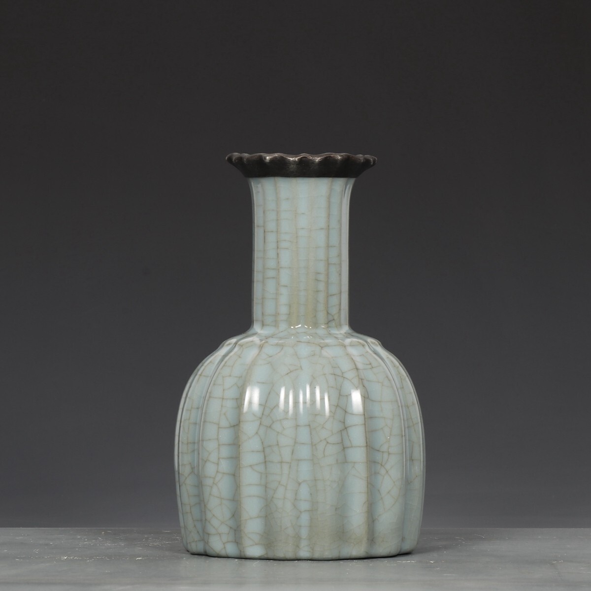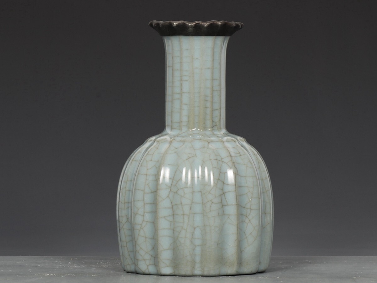 宋代 官窯 陶磁器 粉青釉 銀口御題 瓜稜尊【仁】染付 置物擺件 古賞物 古美術 中国古玩 蔵出
