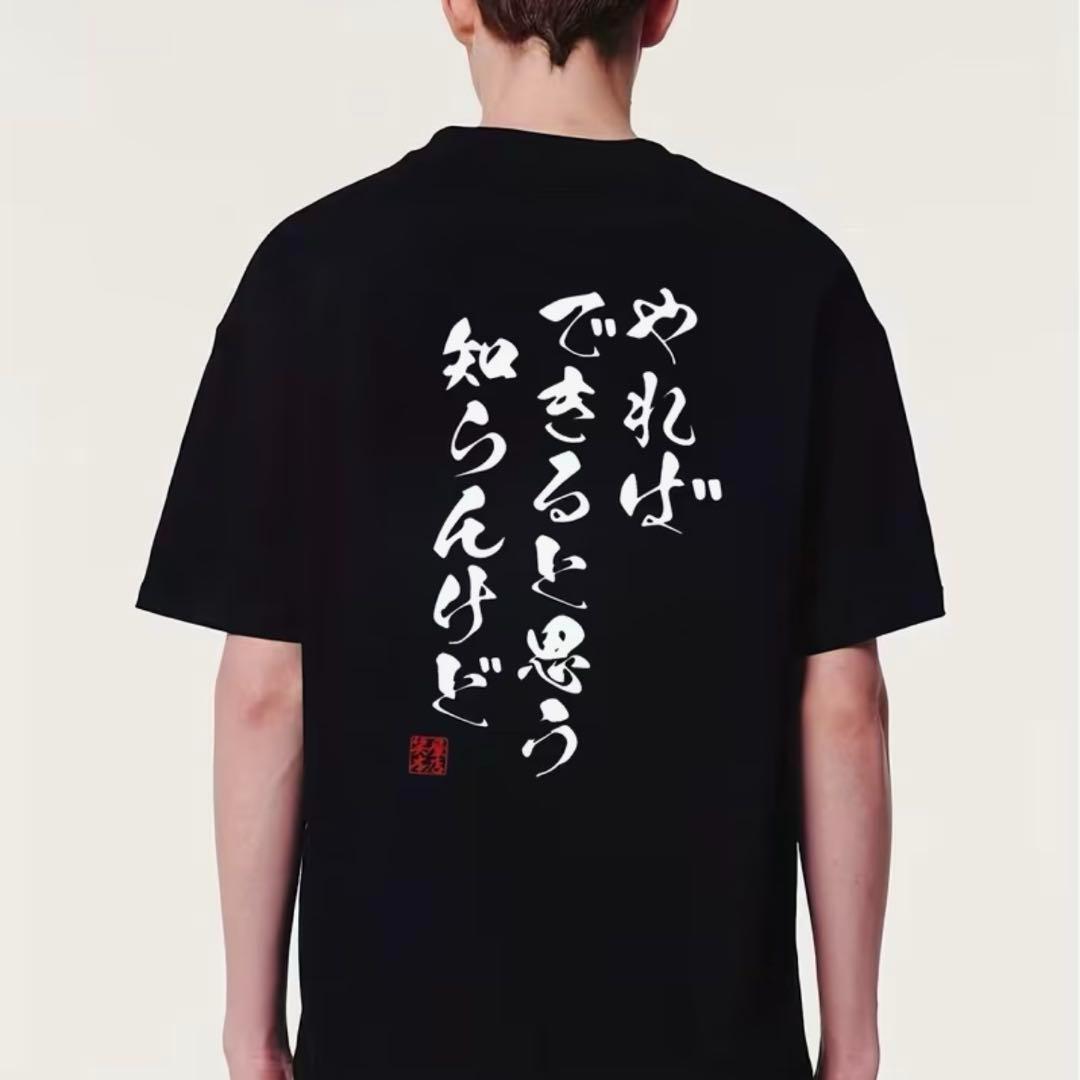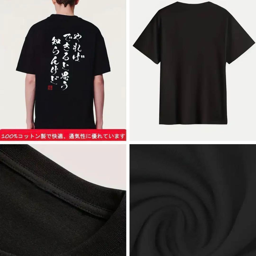 100%コットン製のカジュアルな黒Tシャツ、背面に日本語のテキストが特徴。