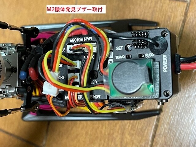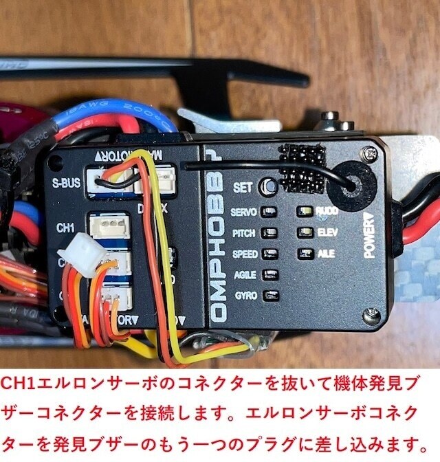 (けつホバリングだけを主体に練習される方はELEVサーボコネクターに接続された方が、フライト中にブザーが鳴りにくいようです。ネオヘリの発見ブザーは墜落して機体が草むらなどに埋まって動かない状態が約35秒間続いている時にブザーが鳴動して、赤のLED灯が点滅するシステムにプログラムされています。広場の草やぶ、山手の空き地などでフライトするときに心強い発見ブザーです。)