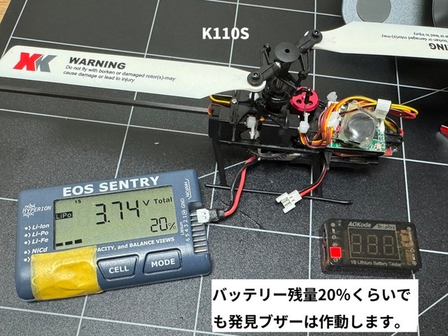 (注意)たまにエラーによってブザーが鳴ったりする場合もあるかもしれませんが、接続するサーボによりますが、エルロンやエレベーターサーボを動かせば鳴り止みます。3Dフライト途中にエラーが出てブザーが鳴るということはほぼありません。また機体のバッテリー電圧が低くなりすぎるとならない場合があります。品質性能が良いと記述いたしましたが、3年前まで販売した1500個の発見ブザーで、ブザーが鳴らないというエラーが出ていないということです。機体にバッテリーを接続した時に必ずブザーが2回鳴ります。これが発見ブザーが正常に作動している証になります。(K110の3.7Vのバッテリーでも、バッテリー残量が20%くらいまでは鳴ります。)