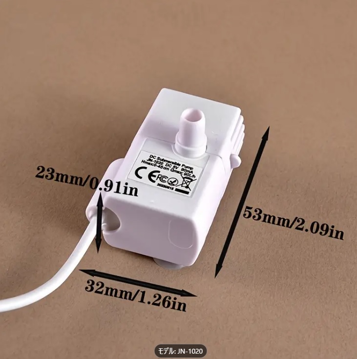 仕様:電圧: DC5VUSB電源;電気: 90mA;最大流量: 90L/H;H-Max(リフト高さ):約 45cm