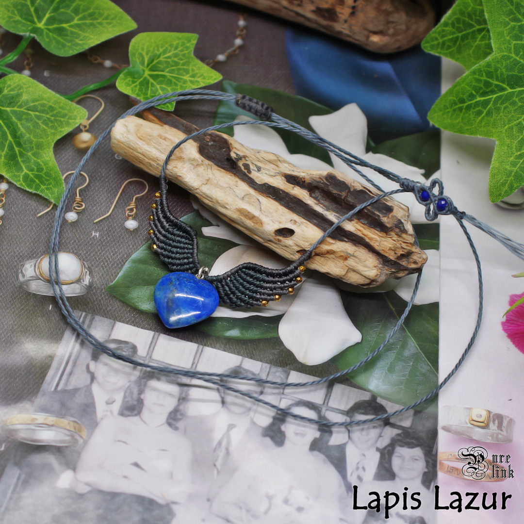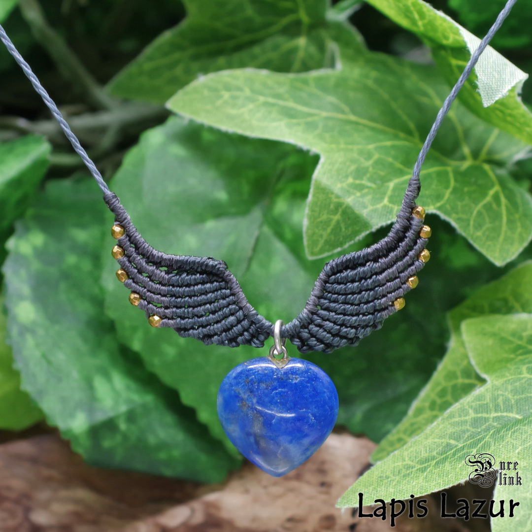 そんな、『ラピスラズリ』のハート.を使用して、を使用して、丁寧に羽・翼をモチーフに編み込み、ただのアクセサリーではなく頼もしいお守りにもなるように、願いを込めて作成した、マクラメ編みアクセサリーです。
