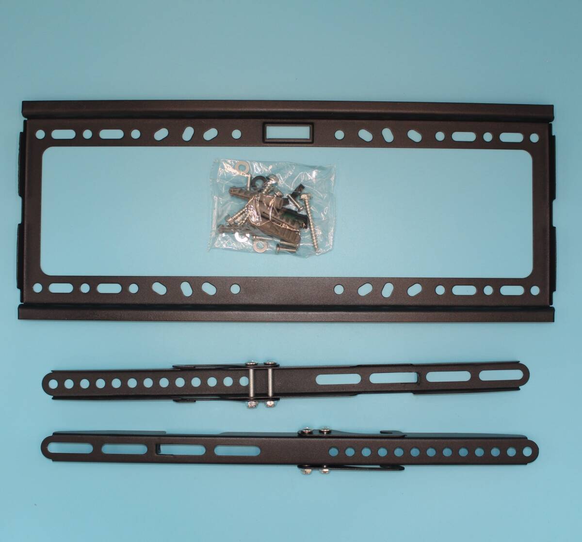 セット内容:本体フレーム、縦フレーム2本、水平器、六角スクリューネジ4本、スクリューネジ用プラアンカ4本、台座カラー4個、ワッシャ4枚、M6x20ボルト6本(テレビ固定用4本+縦フレーム固定用2本)、M8x20ボルト4本(テレビ固定用)
